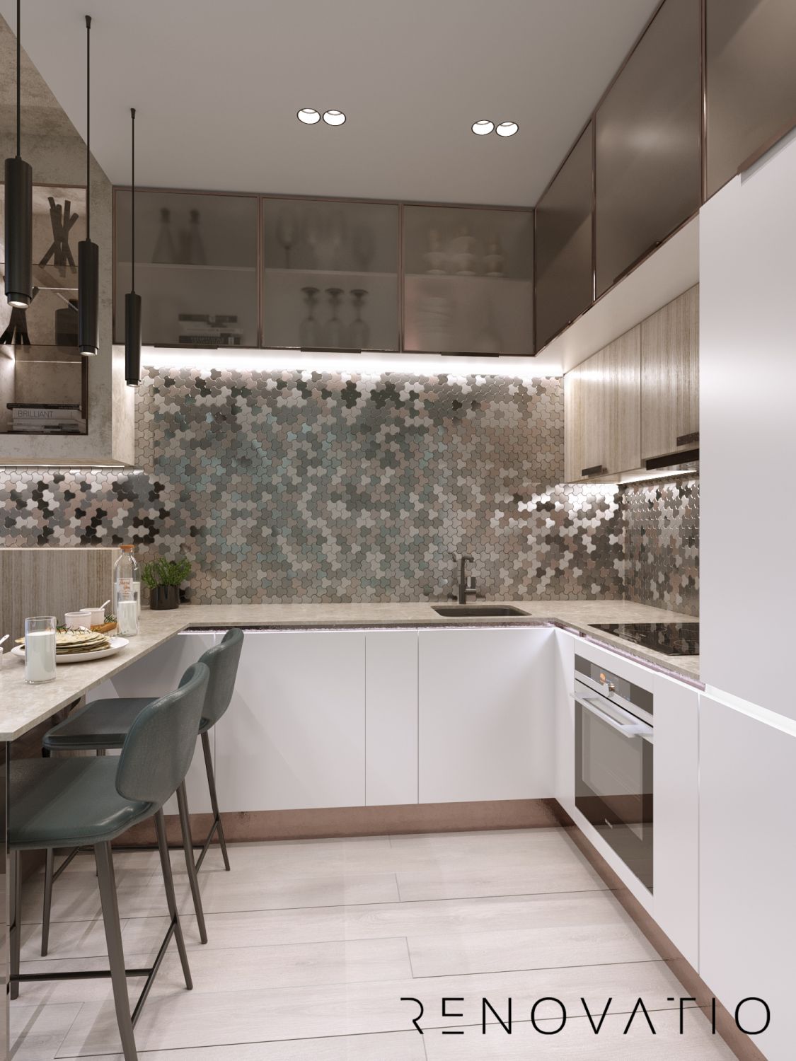 The kitchen-dining area is small, but at the same time, due to the compact arrangement of all elements, everything you need is present in it. The working area is laid with mosaics, which removes the visual load from the walls. Lightness is added by white furniture and zoning in lighting.
