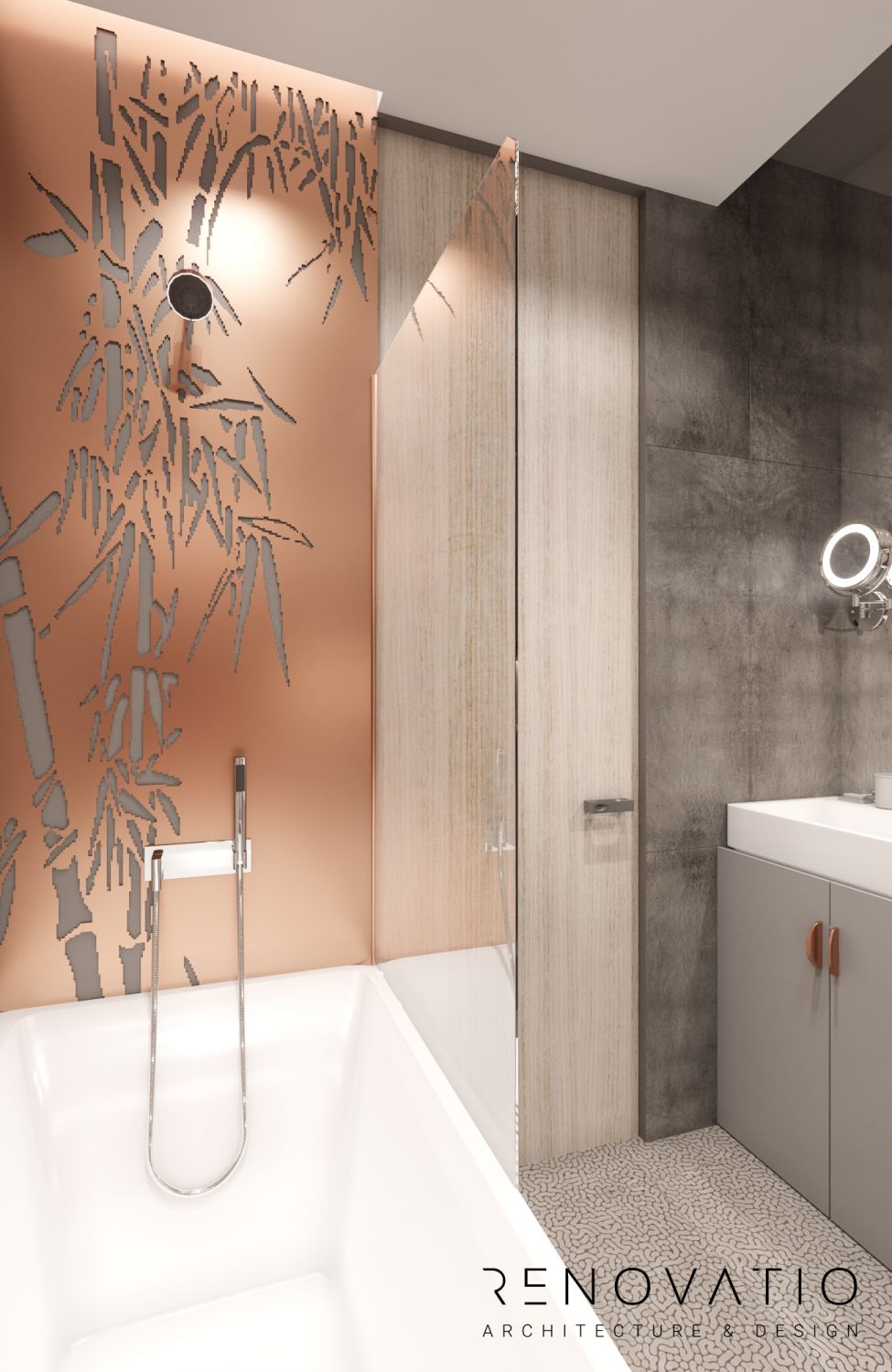 A sufficiently large mirror was installed in the bathroom, which visually enlarges the room. Elongated lamps, a vertical pattern in the shower area and even a vertical heated towel rail all affect the visual lengthening of a small bathroom.