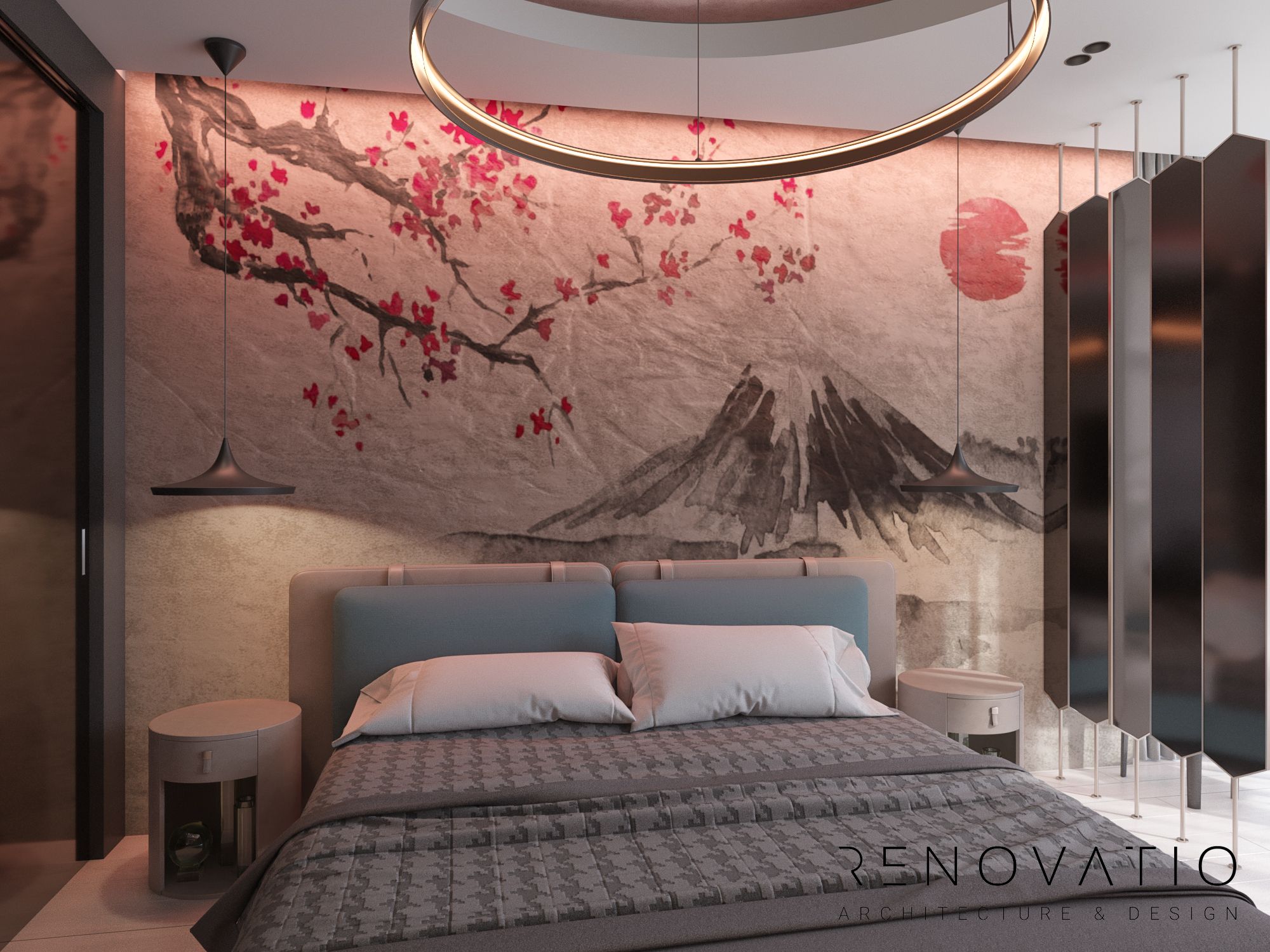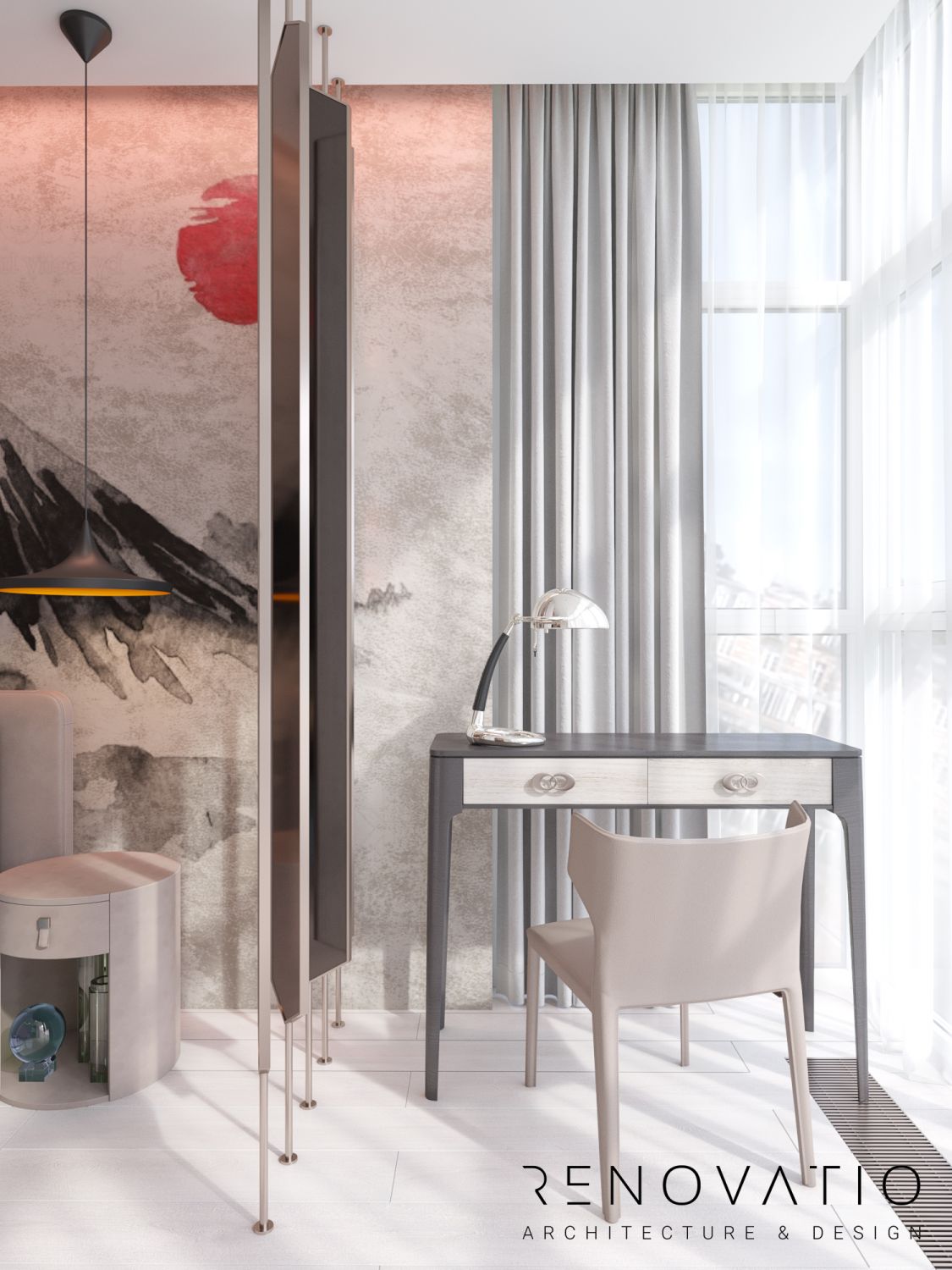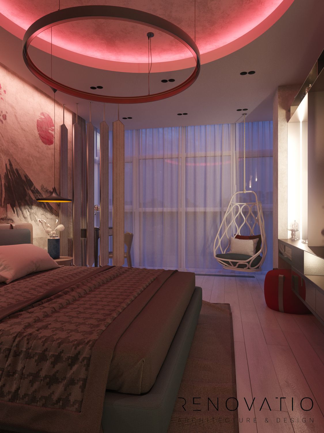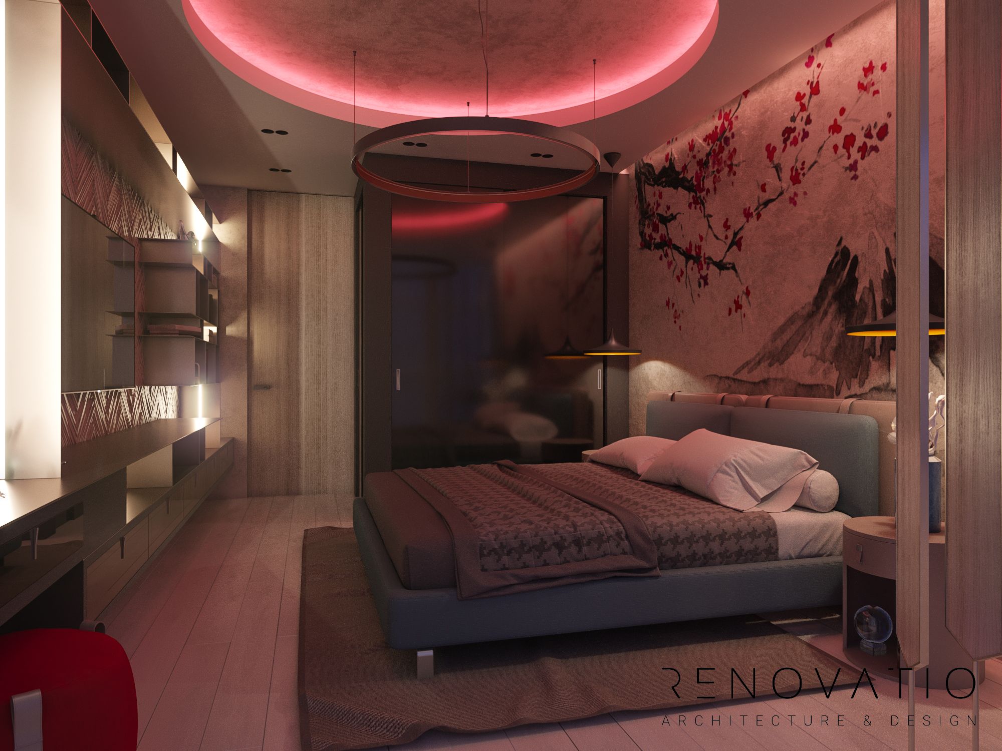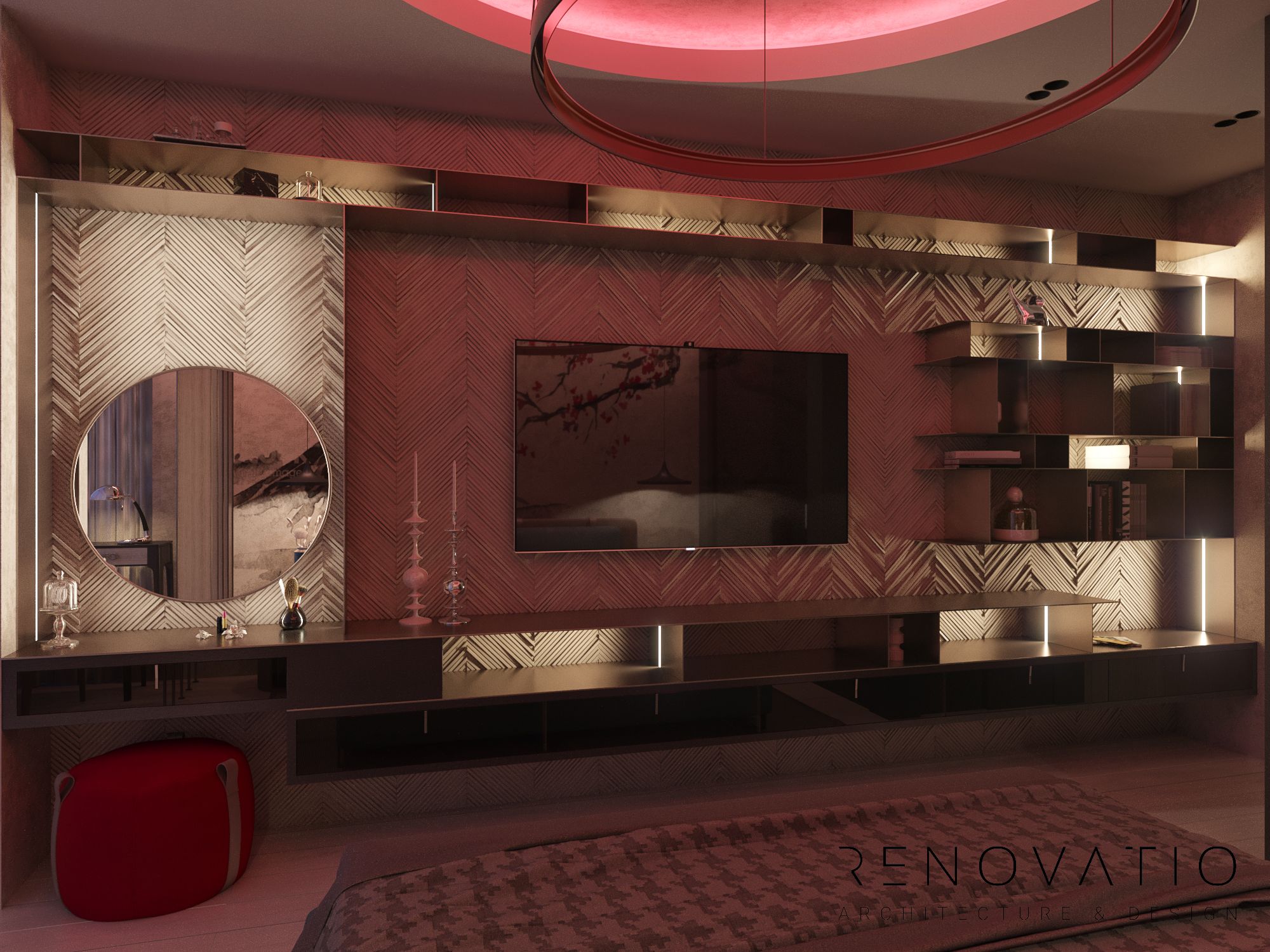 The bedroom is very cozy with a wonderful care area: a soft pouf and a round mirror that softens the rest of the corner shapes. Particularly noteworthy is the lighting - soft pink light, which is especially relaxing at night.