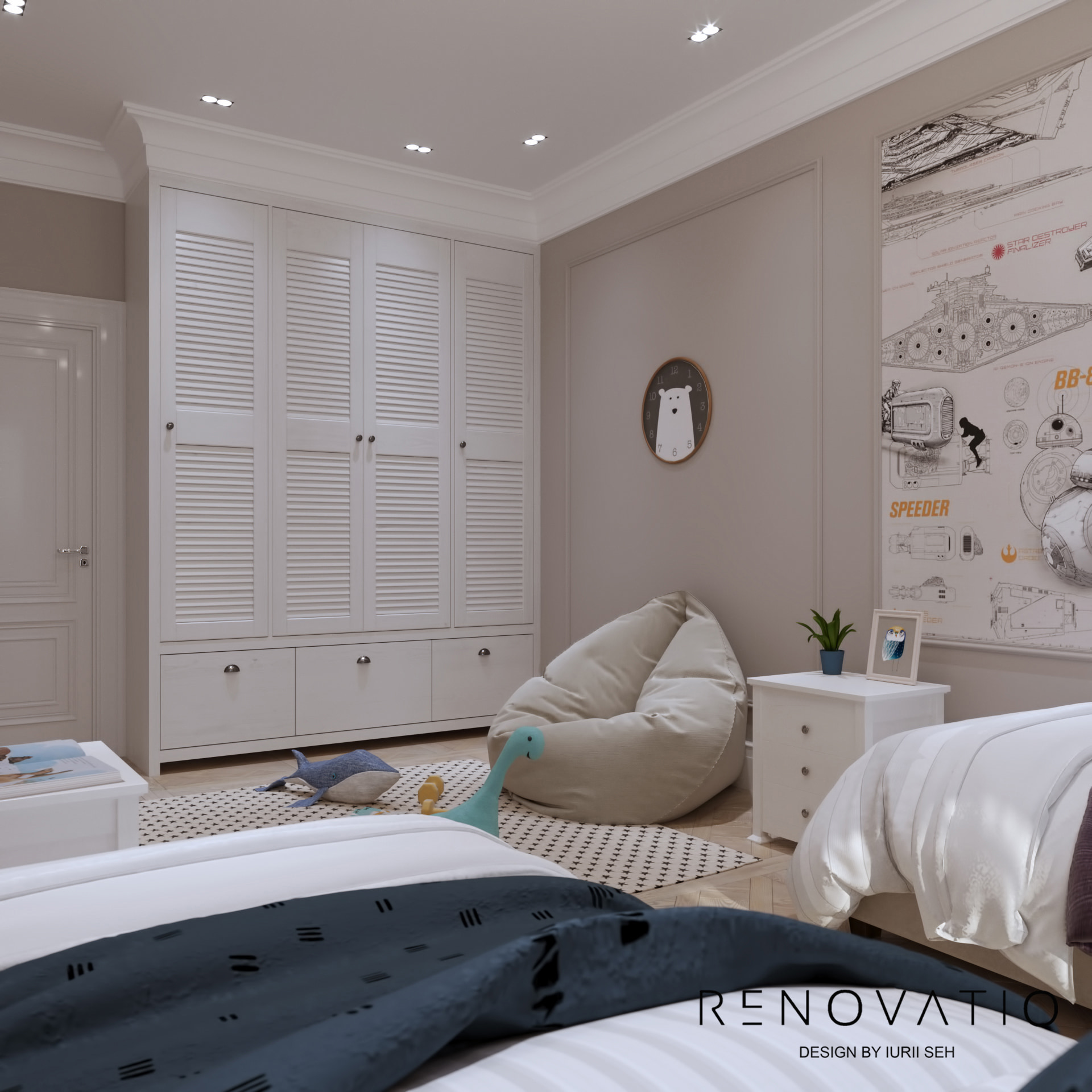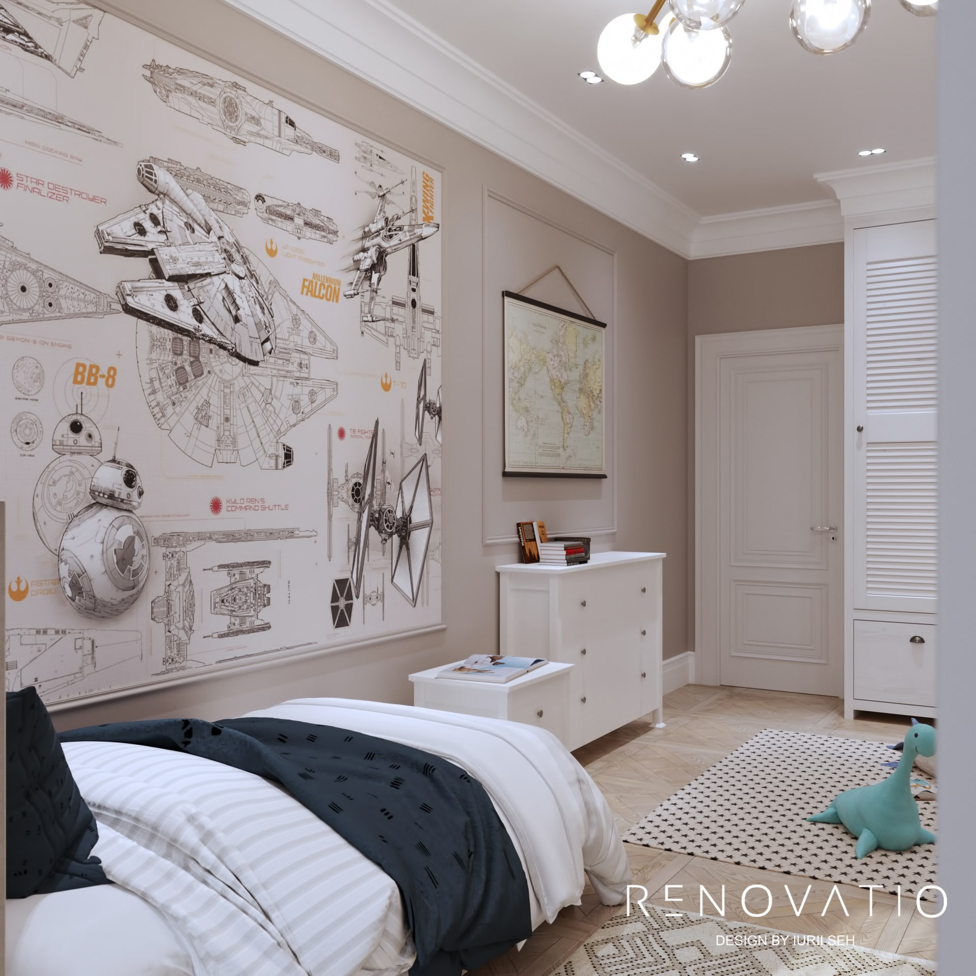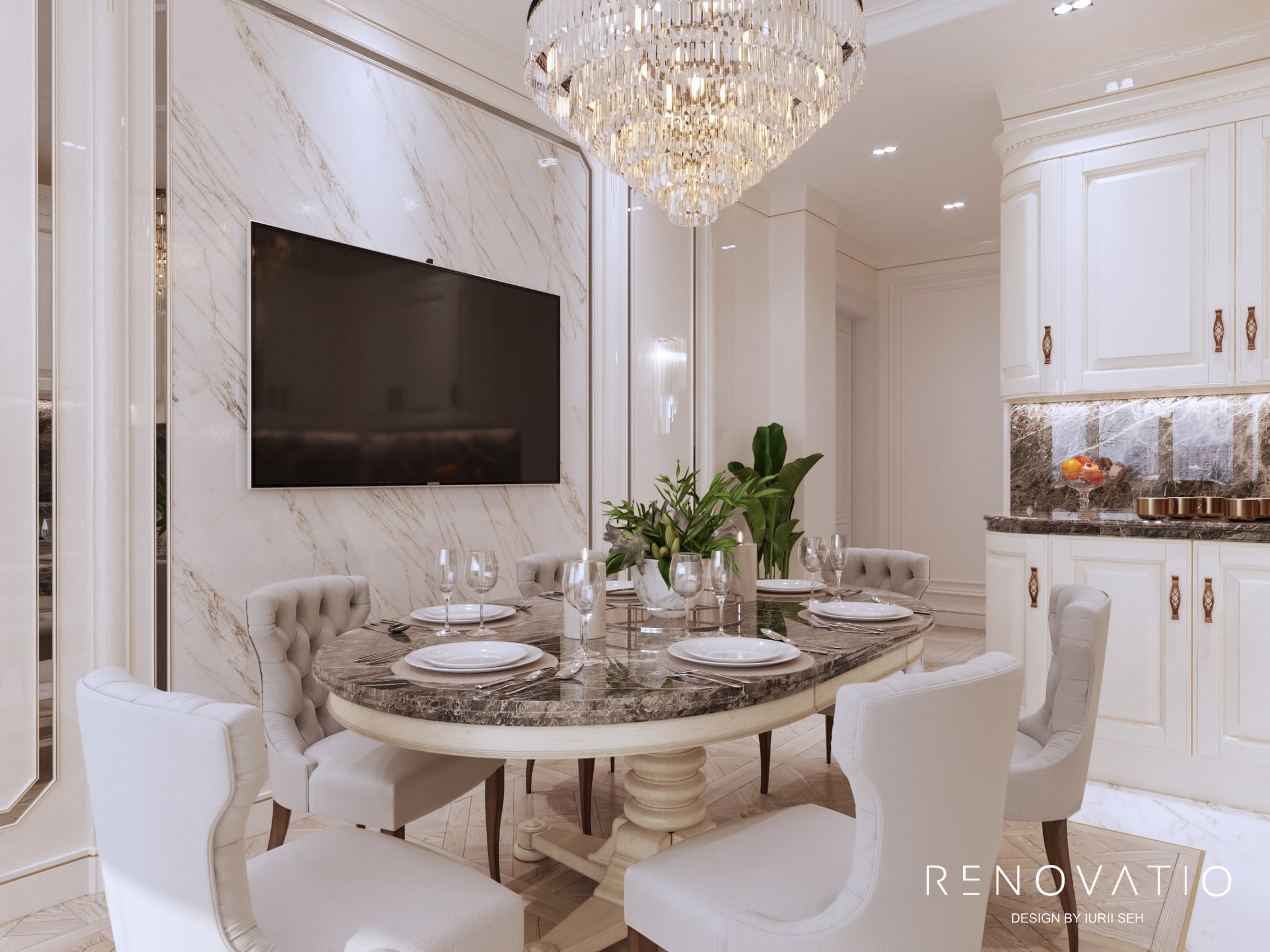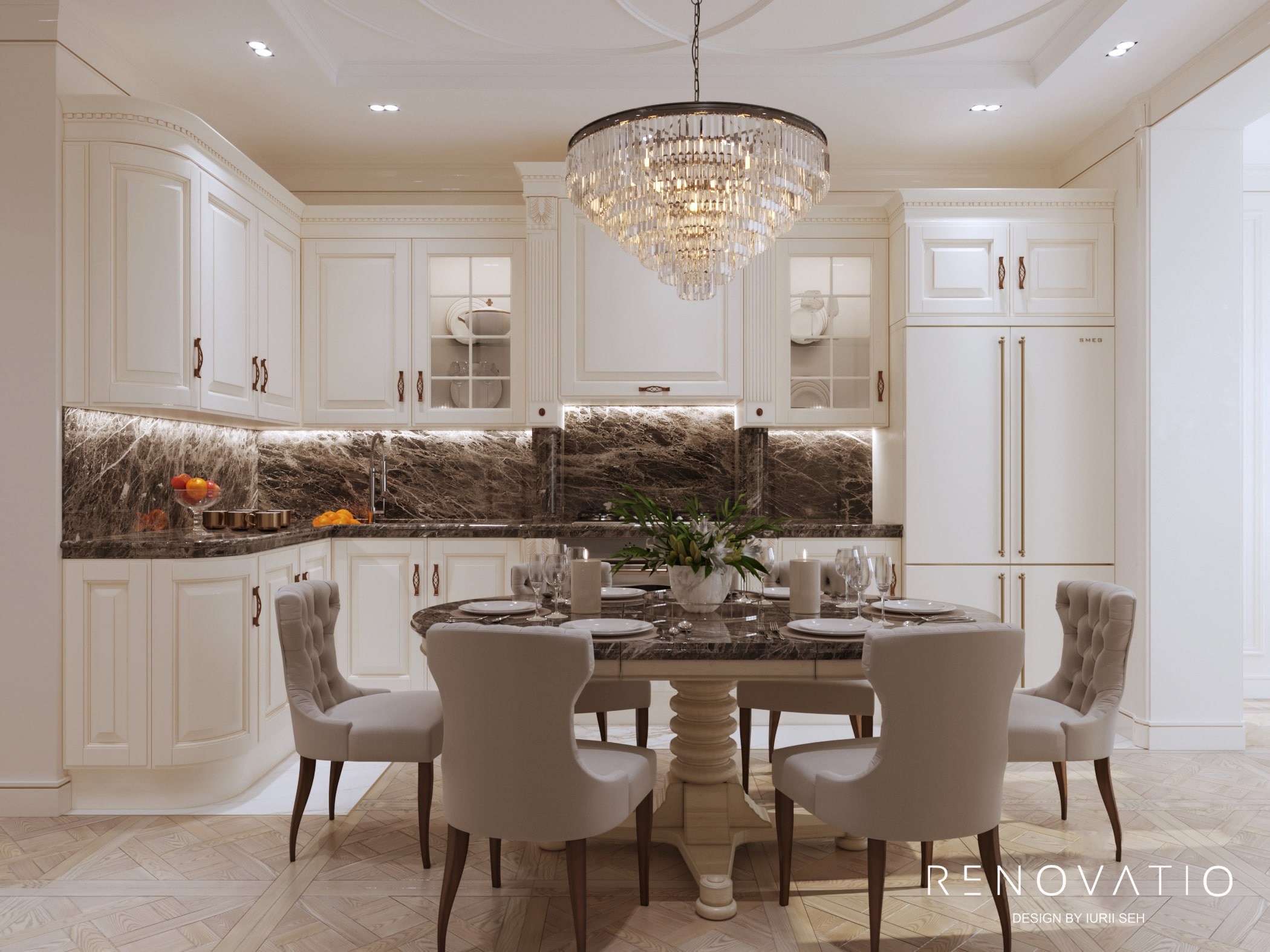 The 1399 sq.ft apartment in the Klovsky Uzviz residential complex for a young couple with two children is made in the Art Deco style. The design turned out as stylish as possible, it surprises and causes admiration at the same time.