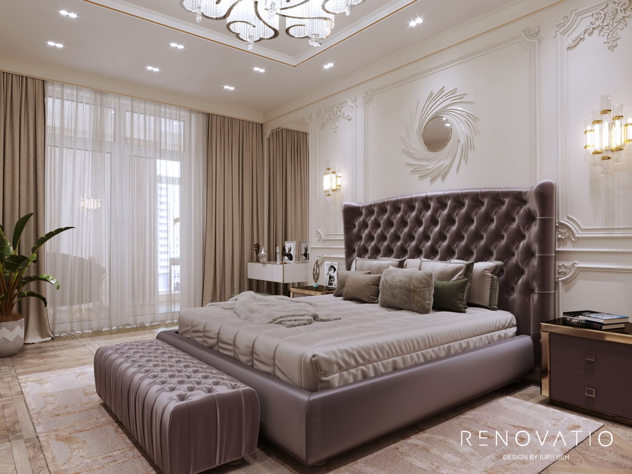 One of the important details of the interior is the color, which emphasizes the status of the design of the apartment. The bedroom is decorated in beige and gold with a noble muted purple accent on the bed, which is accentuated by the bright luster of mirrors and crystal.