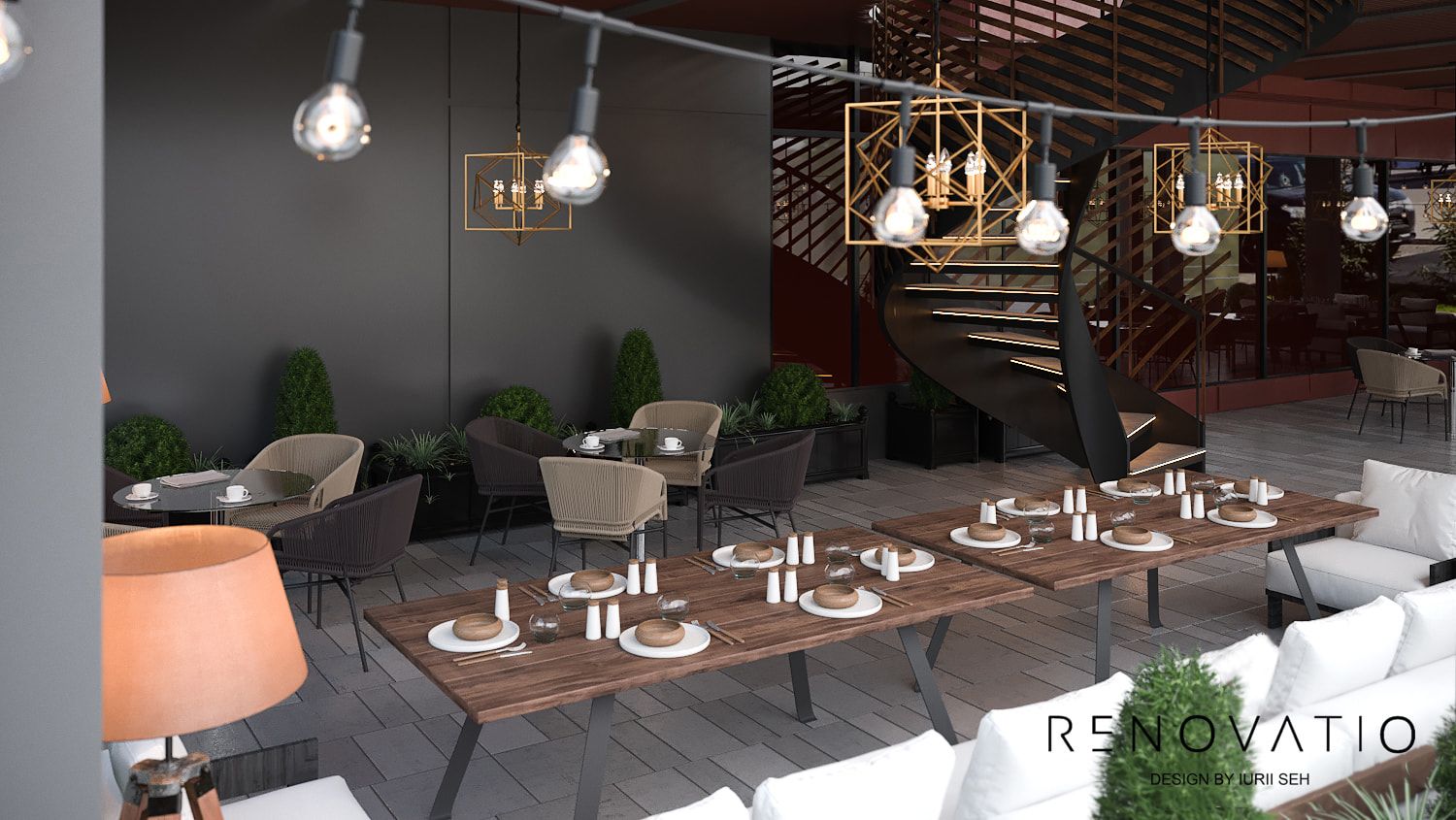 A terrace with huge windows is a great solution. By adding a little greenery and spot lighting to the interior, the result is the most romantic design. The tables are made of natural wood, which adds comfort and warmth.