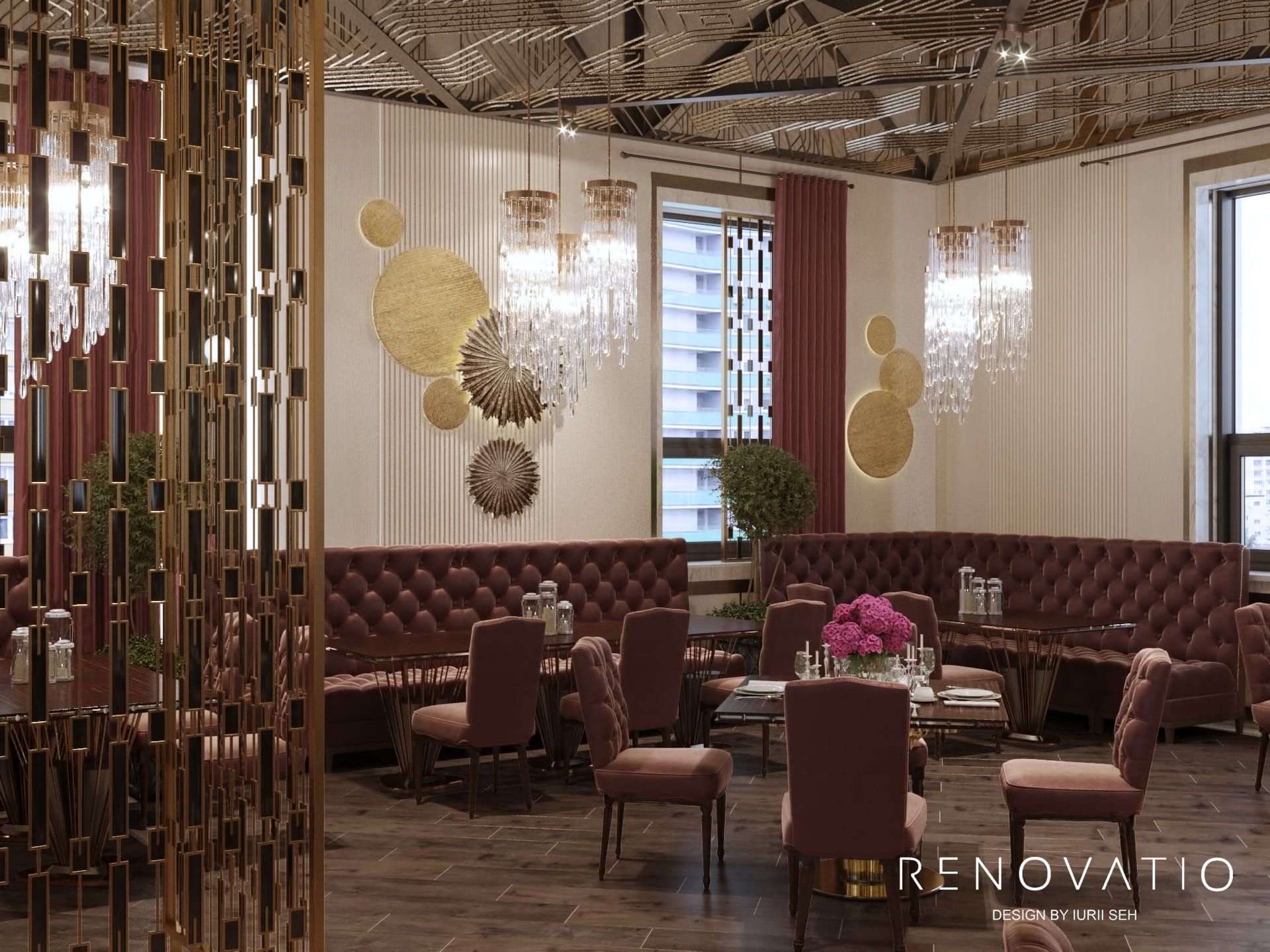 The muted color scheme of the hall relaxes and adjusts for a pleasant pastime, while bright accents and original finishes bring a touch of variety to the interior. That is why we used calm beige and brown shades as a base and added deep burgundy as an accent.