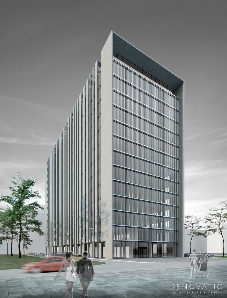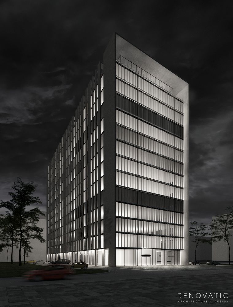 The modern multi-storey business center is made of glass. Only small concrete slabs create lines of completeness. Due to the glass, the space is filled with light and looks stylish both day and night.