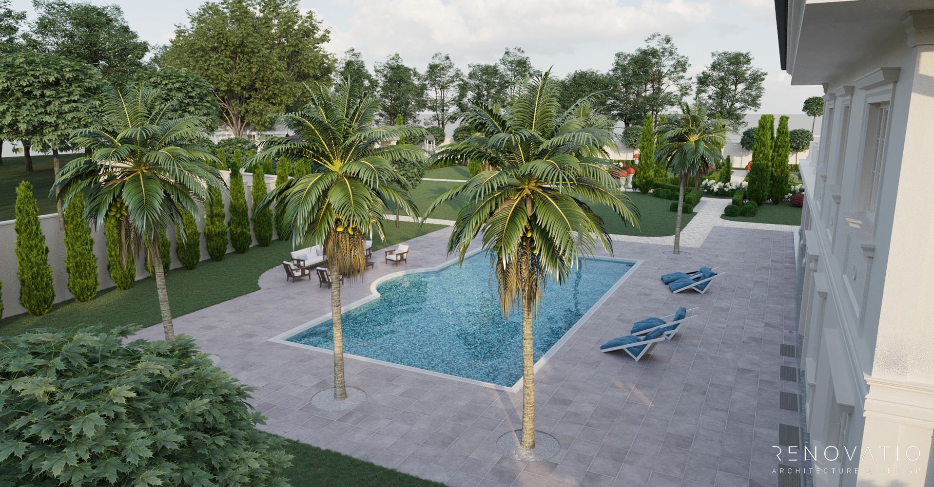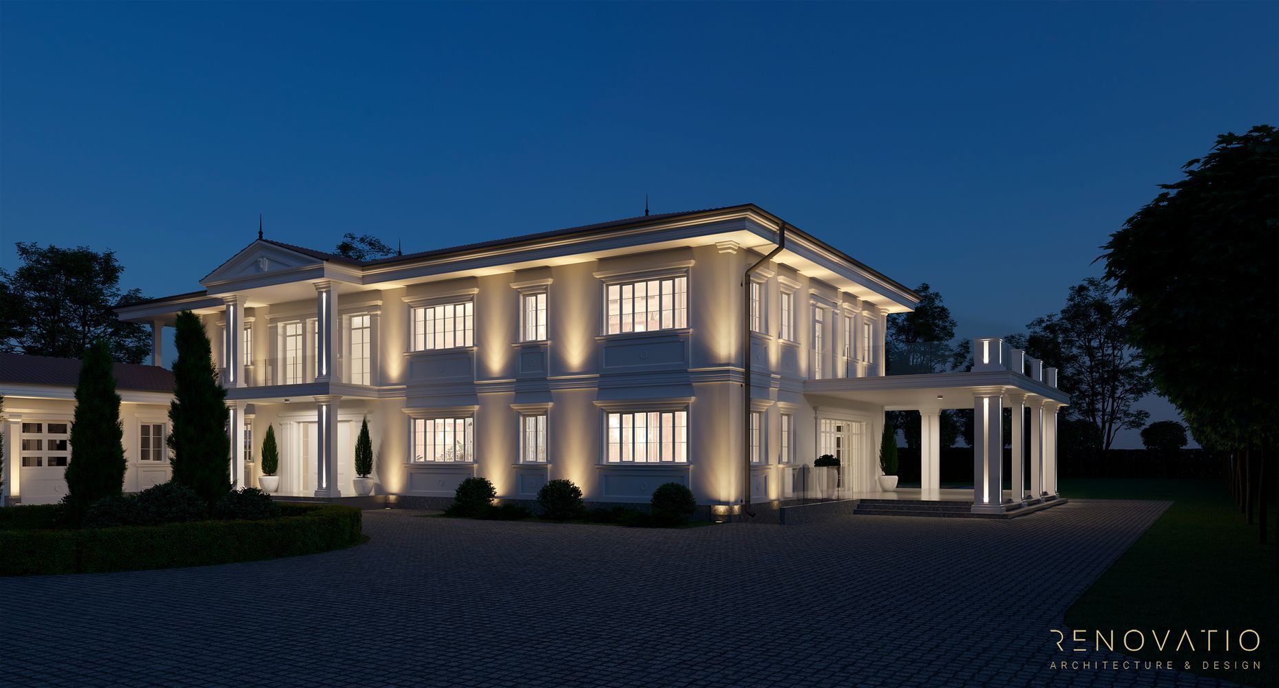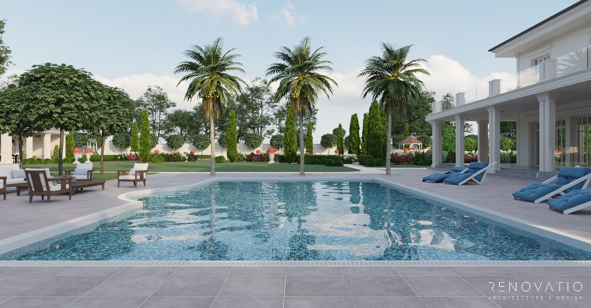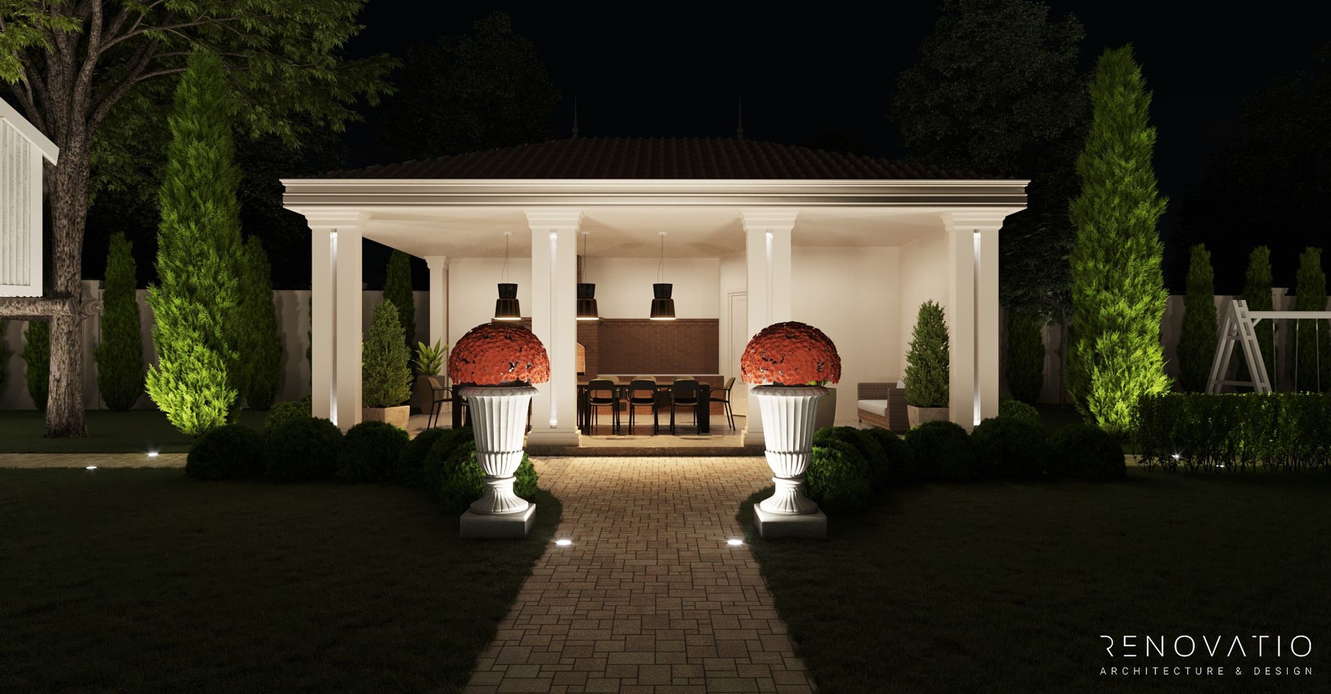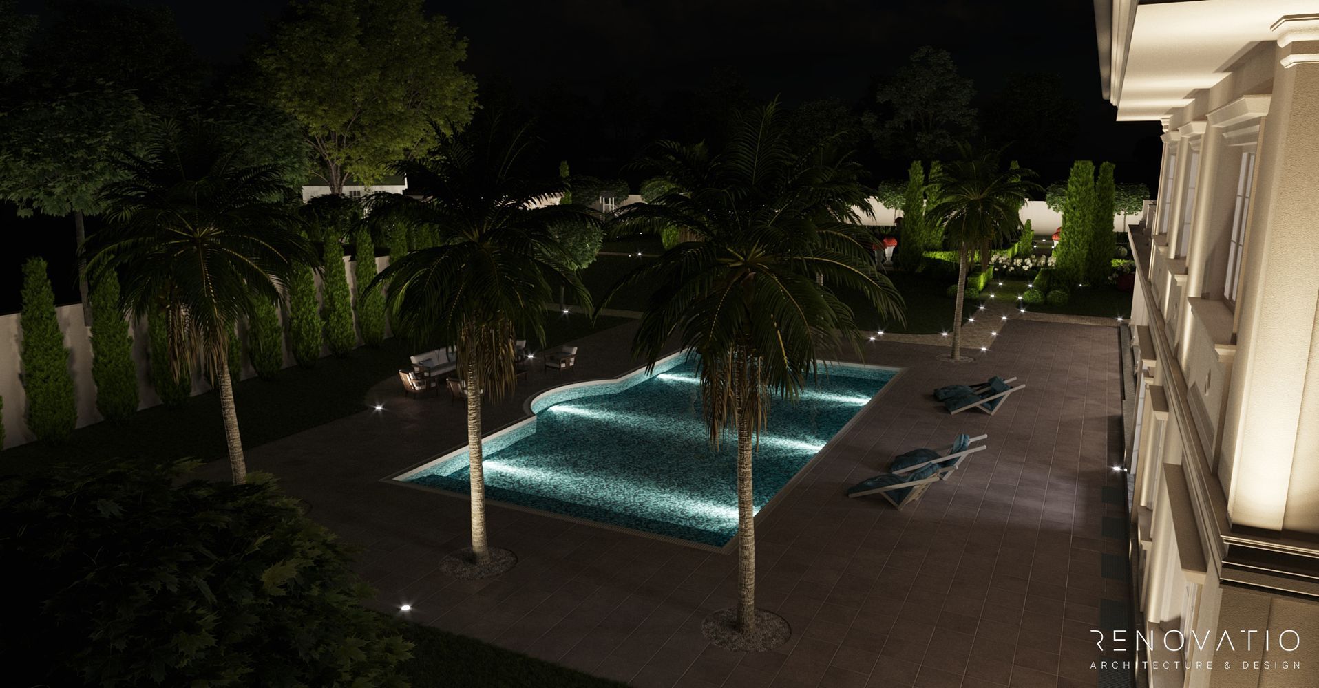 In this project, we have developed several recreation areas: several gazebos for solitude or loud outdoor parties, a pool area with palm trees and a garden area. Each area has a special well-designed lighting. The house itself is also equipped with a lighting system, so the exterior at night looks just as refined, stylish and elegant.