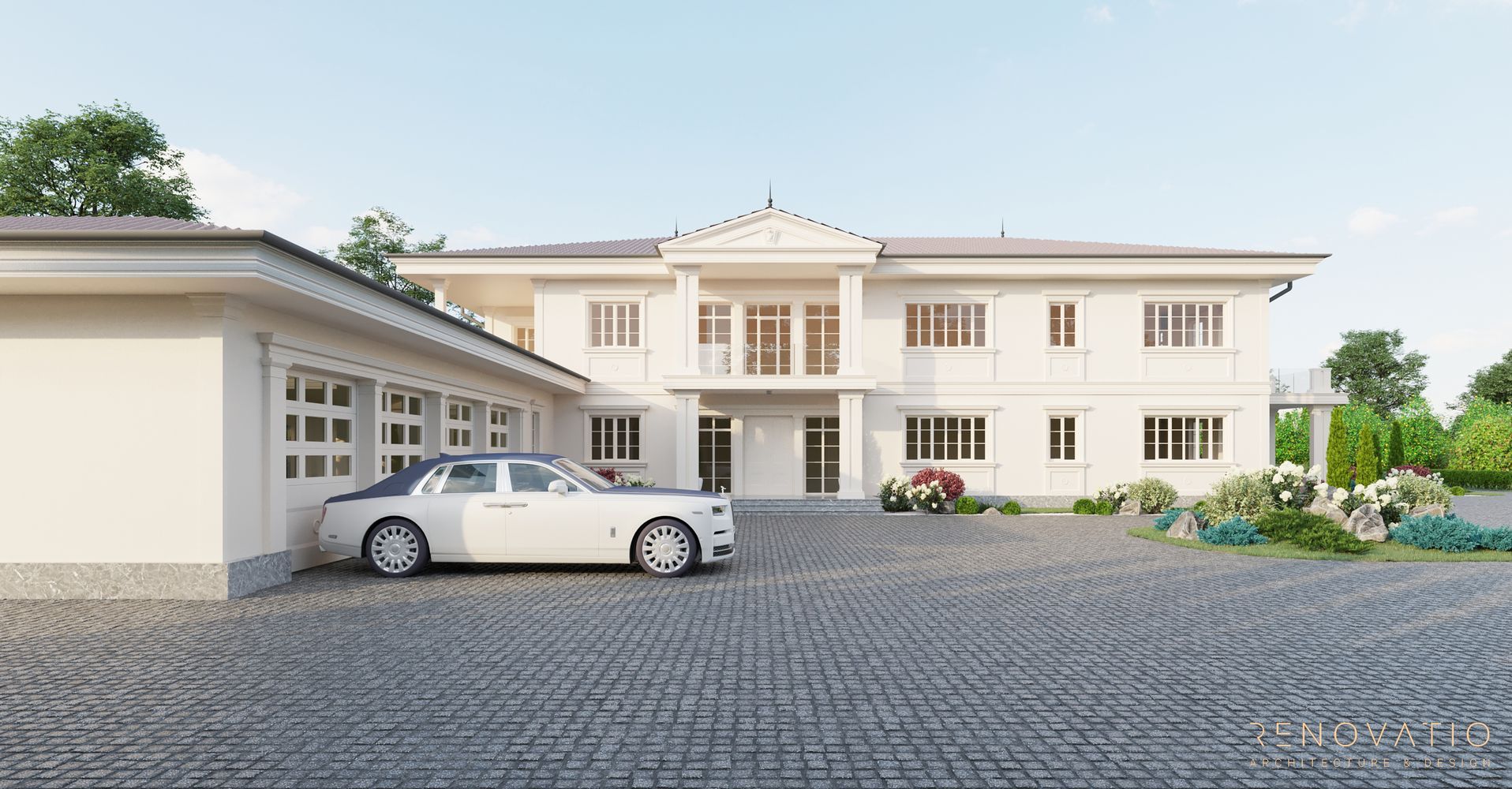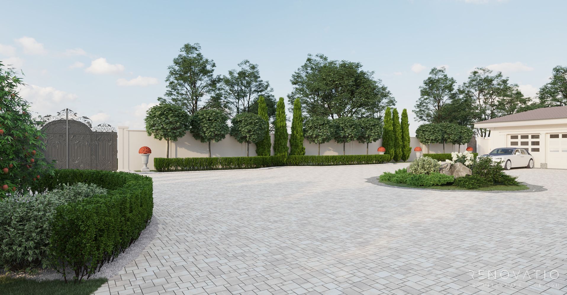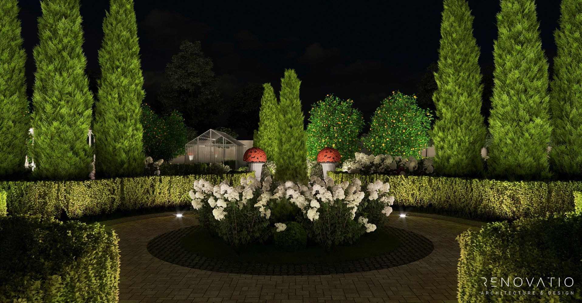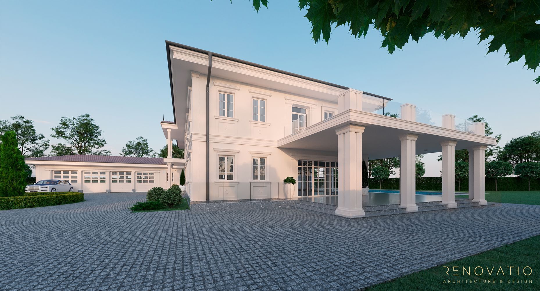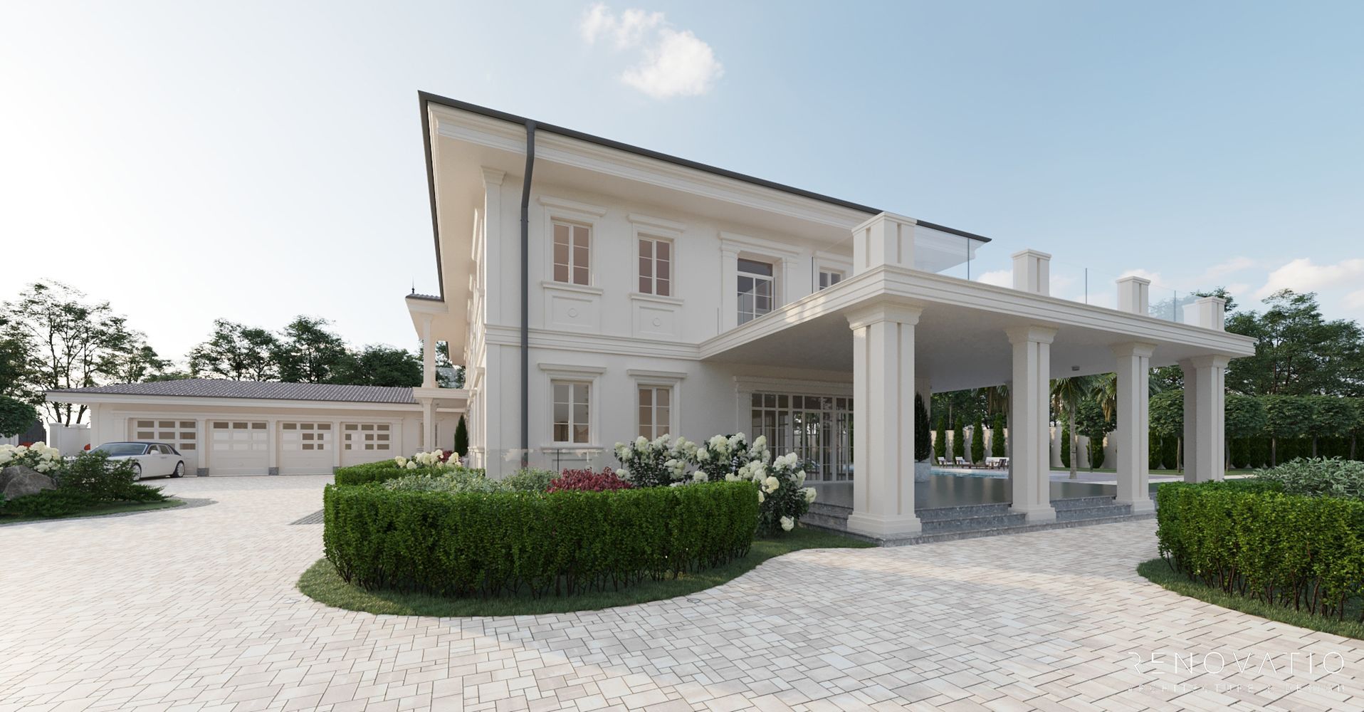 In this project, we have developed several recreation areas: several gazebos for solitude or loud outdoor parties, a pool area with palm trees and a garden area. Each area has a special well-designed lighting. The house itself is also equipped with a lighting system, so the exterior at night looks just as refined, stylish and elegant.