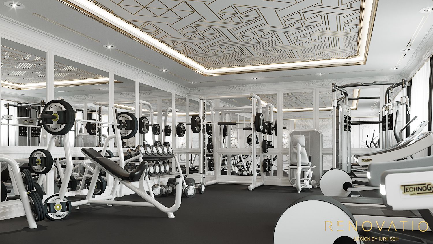 The hall is designed in a classic style, in muted gray and white colors so as not to stand out from the overall design of the house. The room has large windows, so we placed the mirrors on the next wall. The floor is made of soundproofing material, so when some family members go in for sports, it absolutely does not interfere with others.