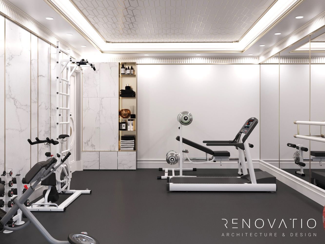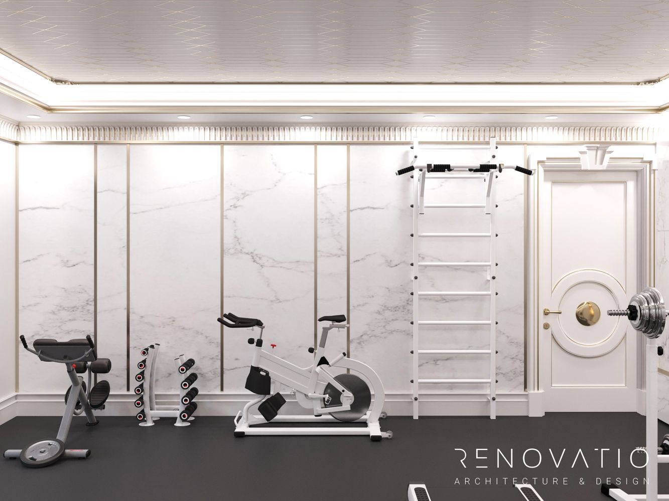 We chose a built-in ceiling light so that it did not interfere with active sports movements. We managed to accommodate everything necessary from the equipment: a cardio area, free weights and a fitness ball.
