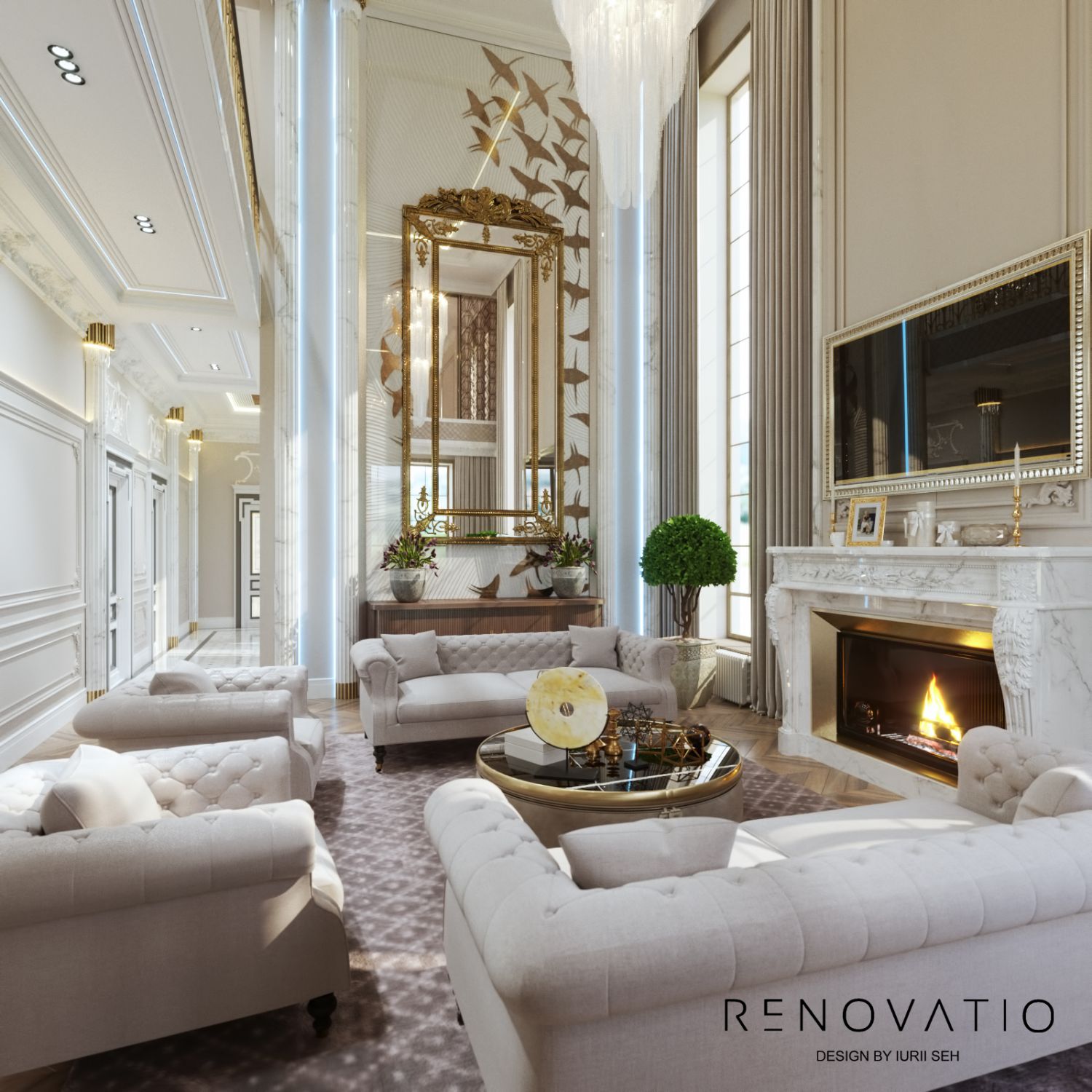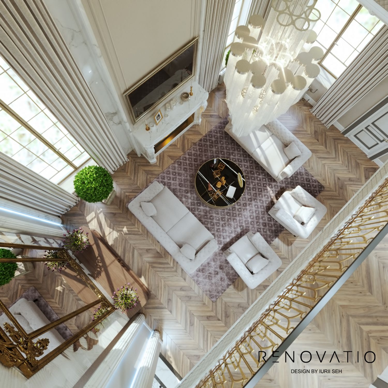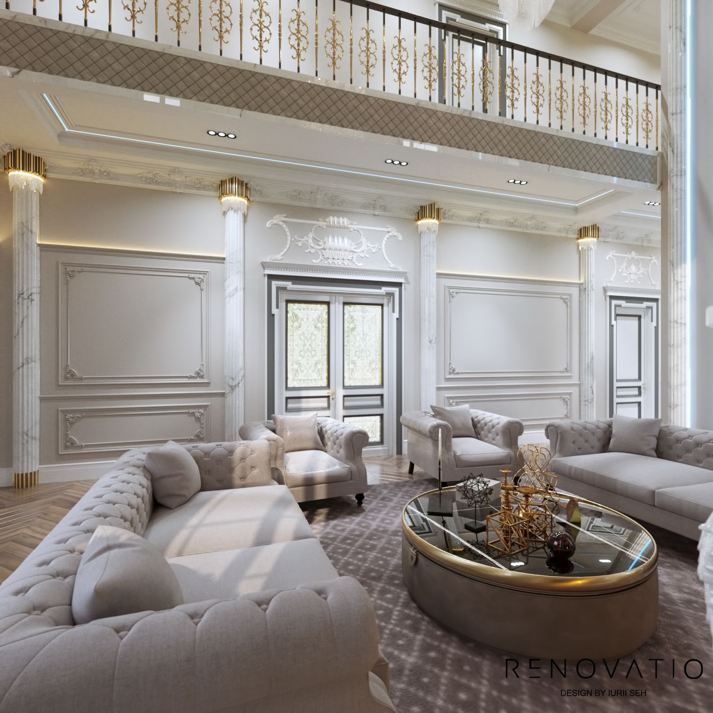 Gold is a noble metal. That is why we used it in the classic design of the 8611 sq.ft. house. It is not for nothing that the luxury and radiance of palaces delight us with their grandeur. This greatness is only emphasized by various decorative elements in gold: chandeliers, stair railings, decorative framing of columns.