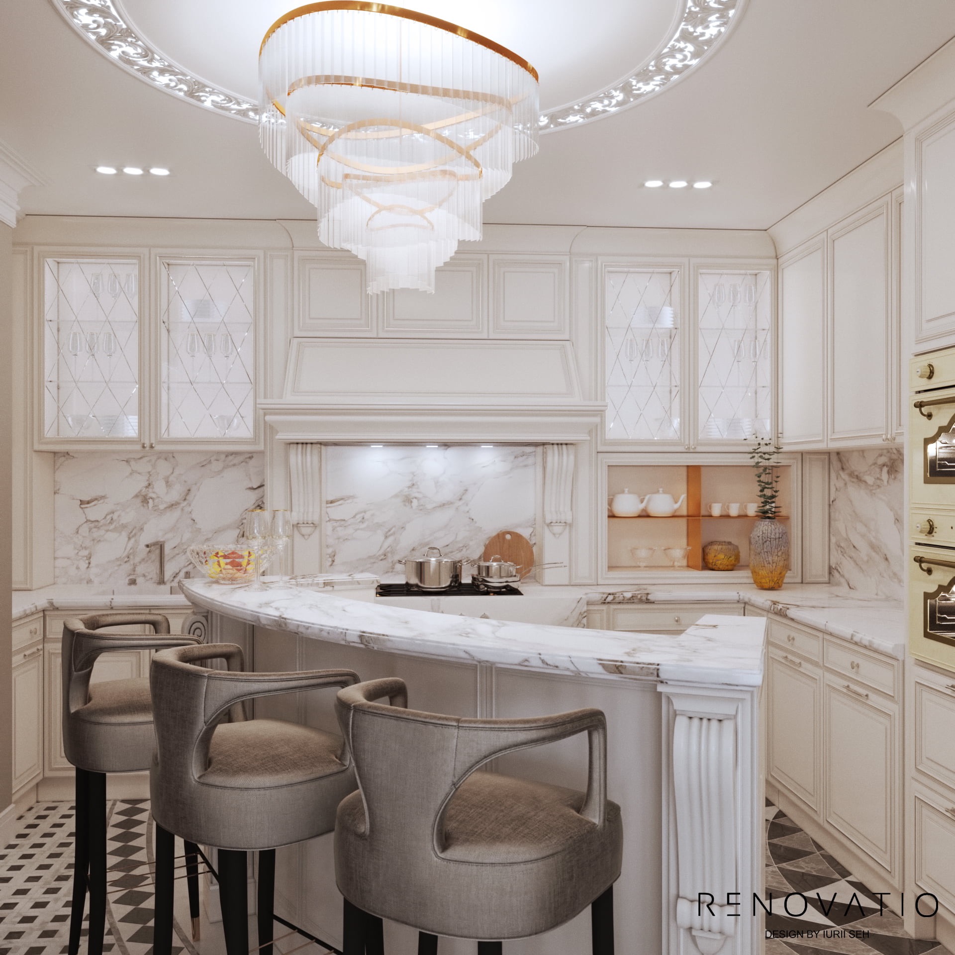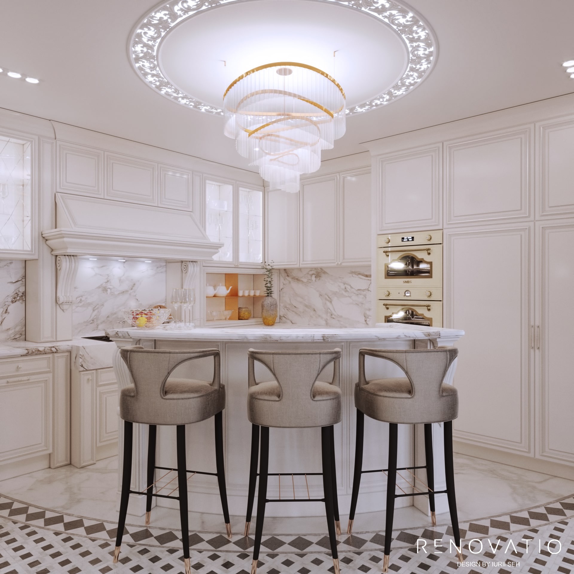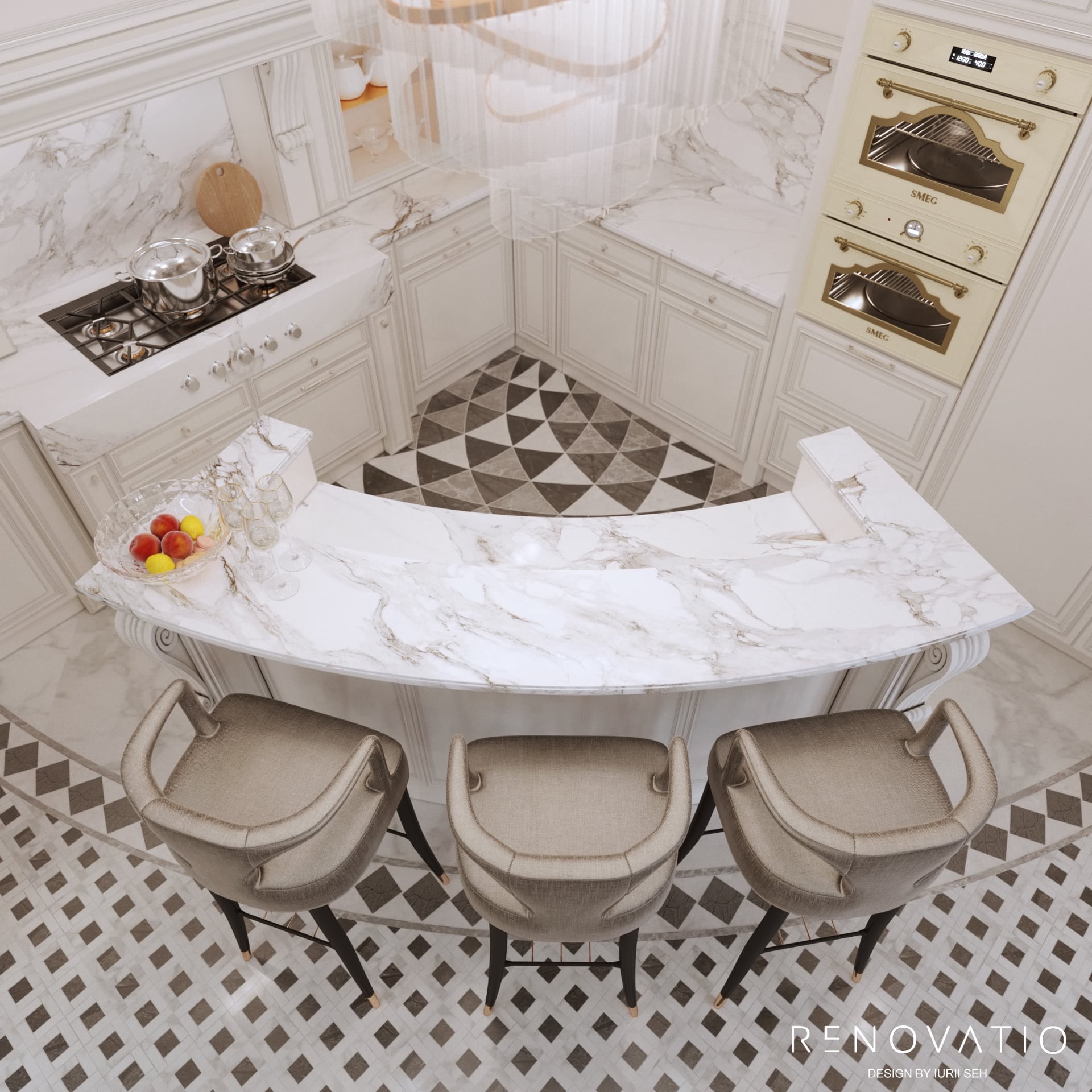 The owners of the house practically do not cook at home, so we made the kitchen area as compact as possible. Literally a corner where they could place everything they needed: a bar counter with a marble top, an oven, a stove and a minimum cooking area.