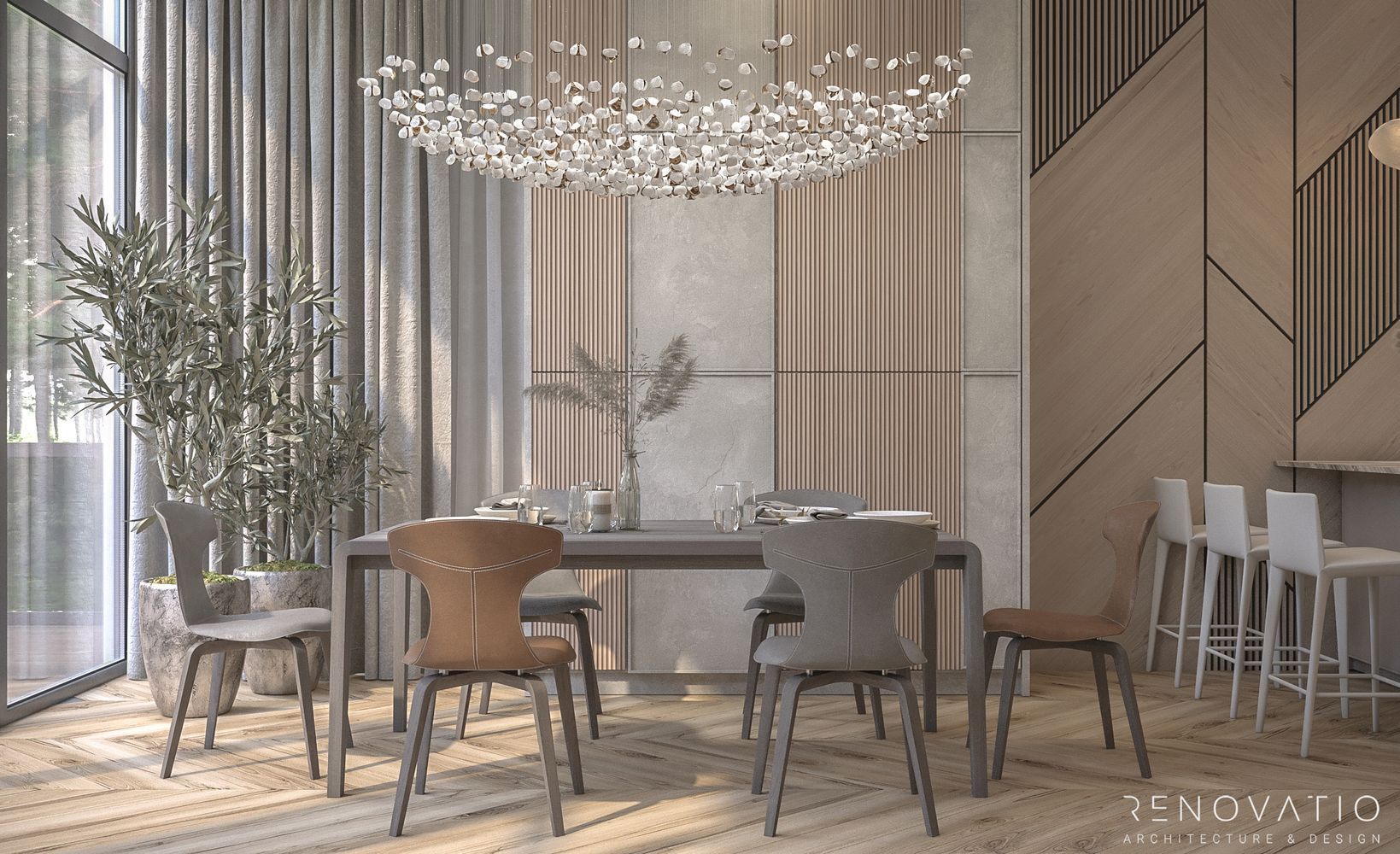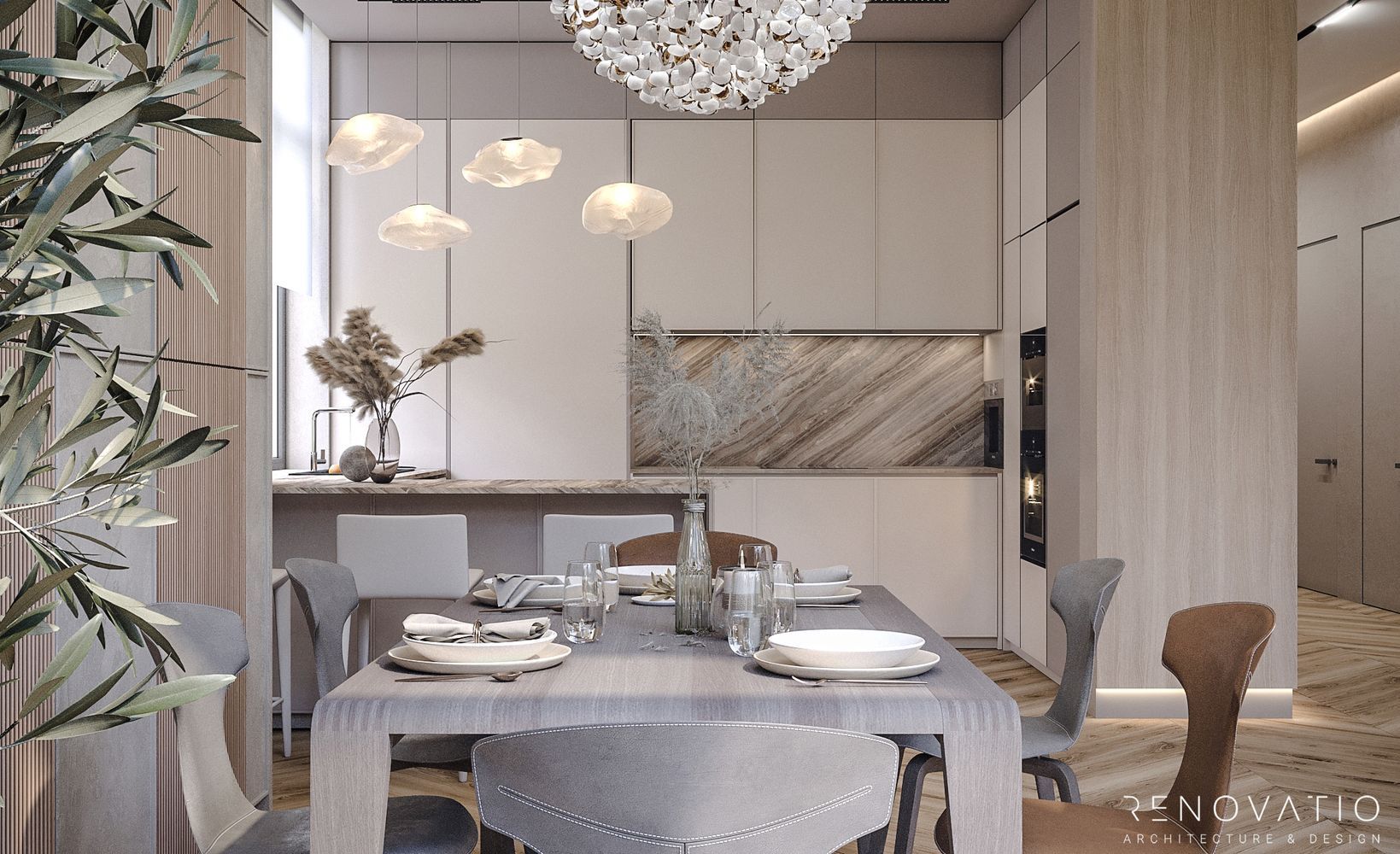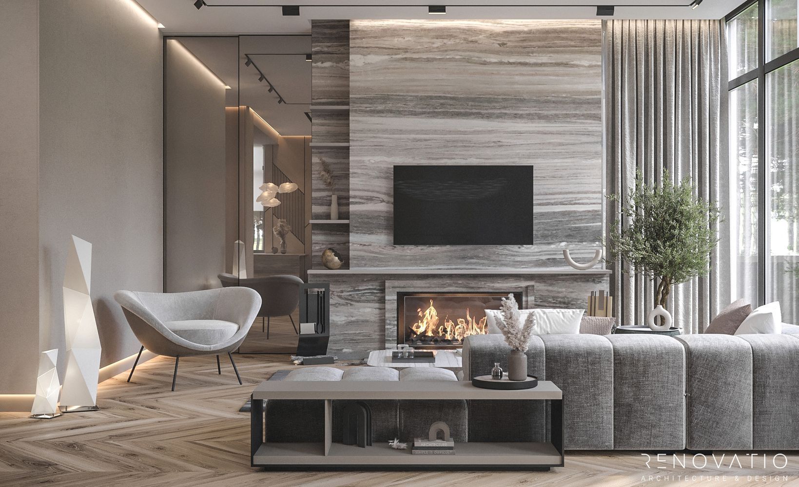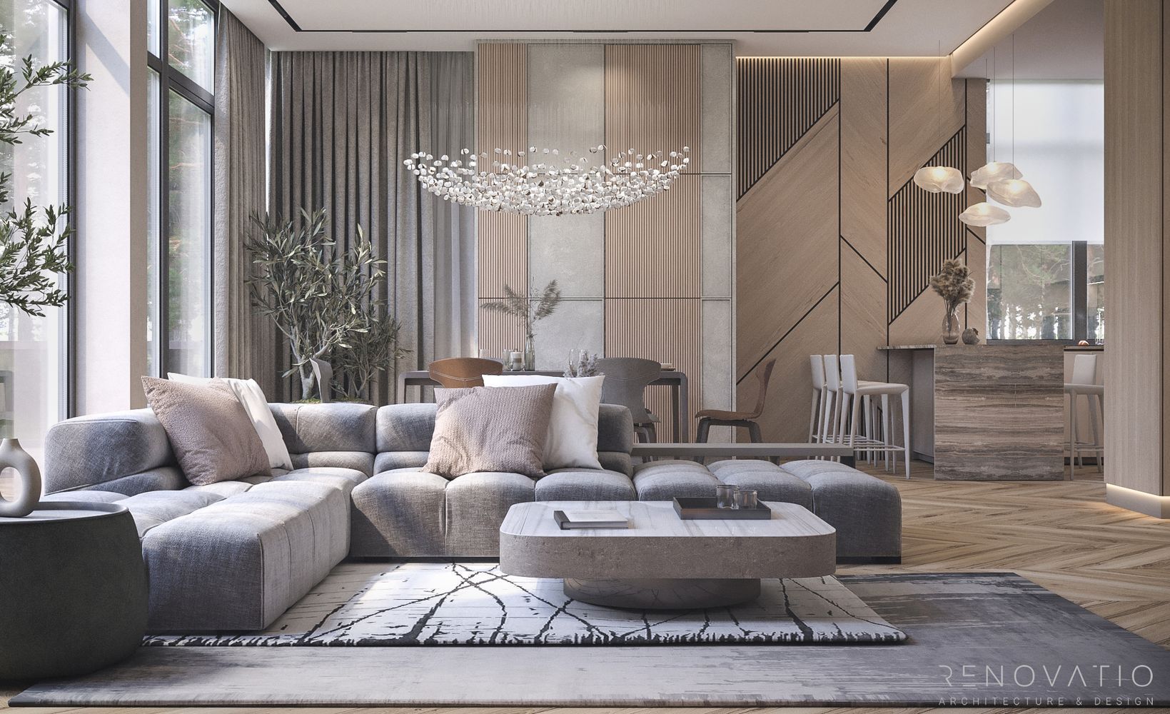 The rounded outlines of sofas and armchairs are complemented by upholstery with a velvety texture, which creates an additional feeling of comfort. The emphasis in the finishing materials is on calm shades and wooden textures. And designer lighting in different areas favorably emphasizes the sophistication and luxury of style.