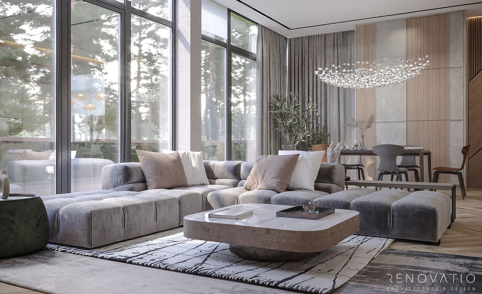 The house with an area of 3229 sq.ft. is made in a modern style. Planning is done on the principle of a large bright space. Panoramic windows, soft gray-beige color scheme. The floor is made of natural wood, which gives the house comfort and warmth.
