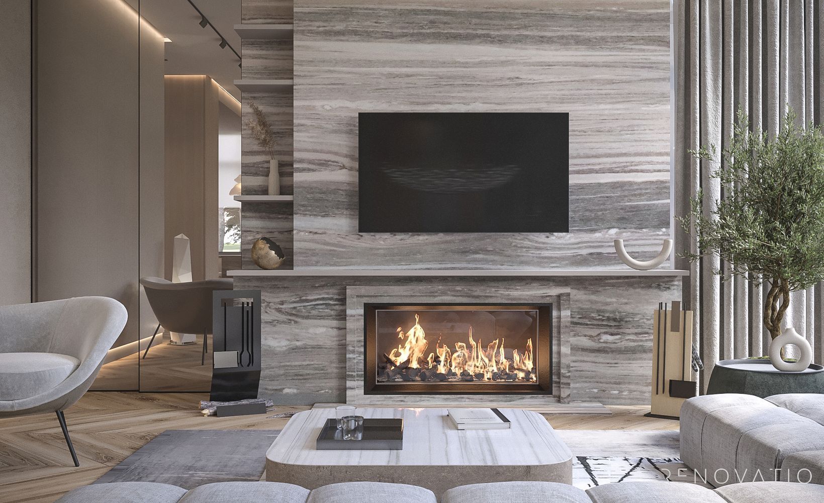 All functional zones pass into each other as smoothly and organically as possible, creating the general concept of convenience and comfort. The fireplace in the living area will definitely gather cheerful companies of friends and family. An independent dining area emphasizes the importance of family values and cozy home in the evening.