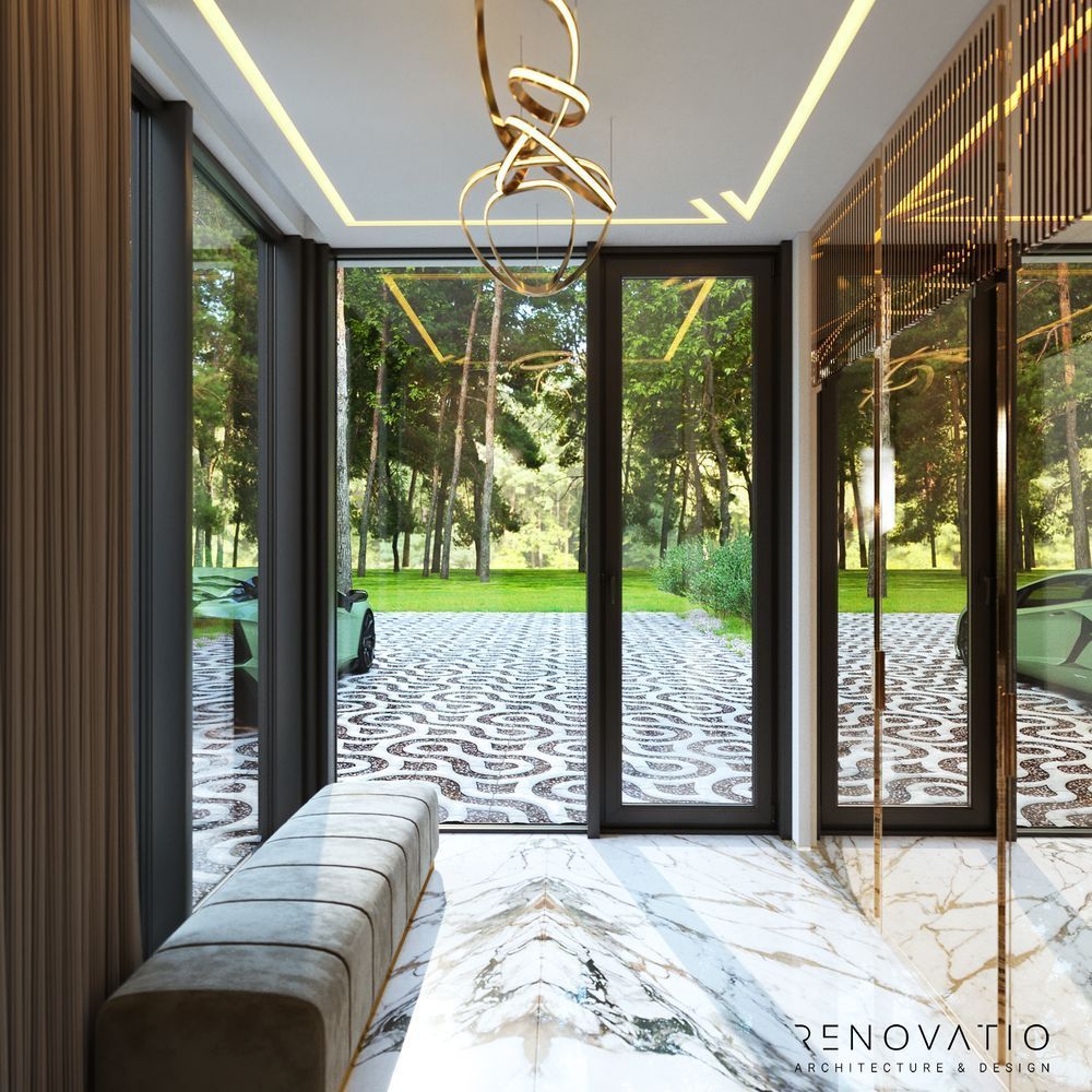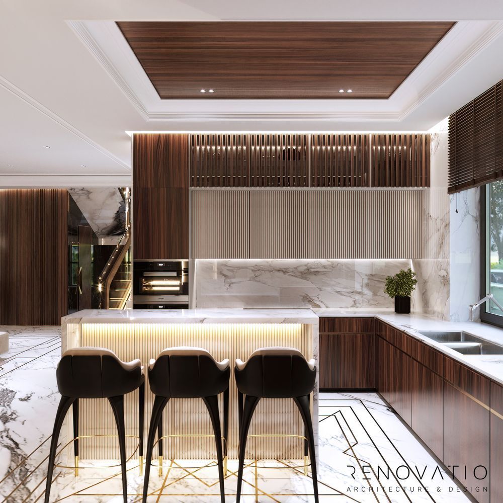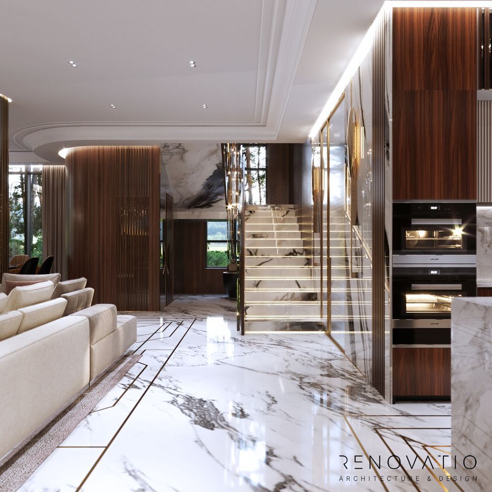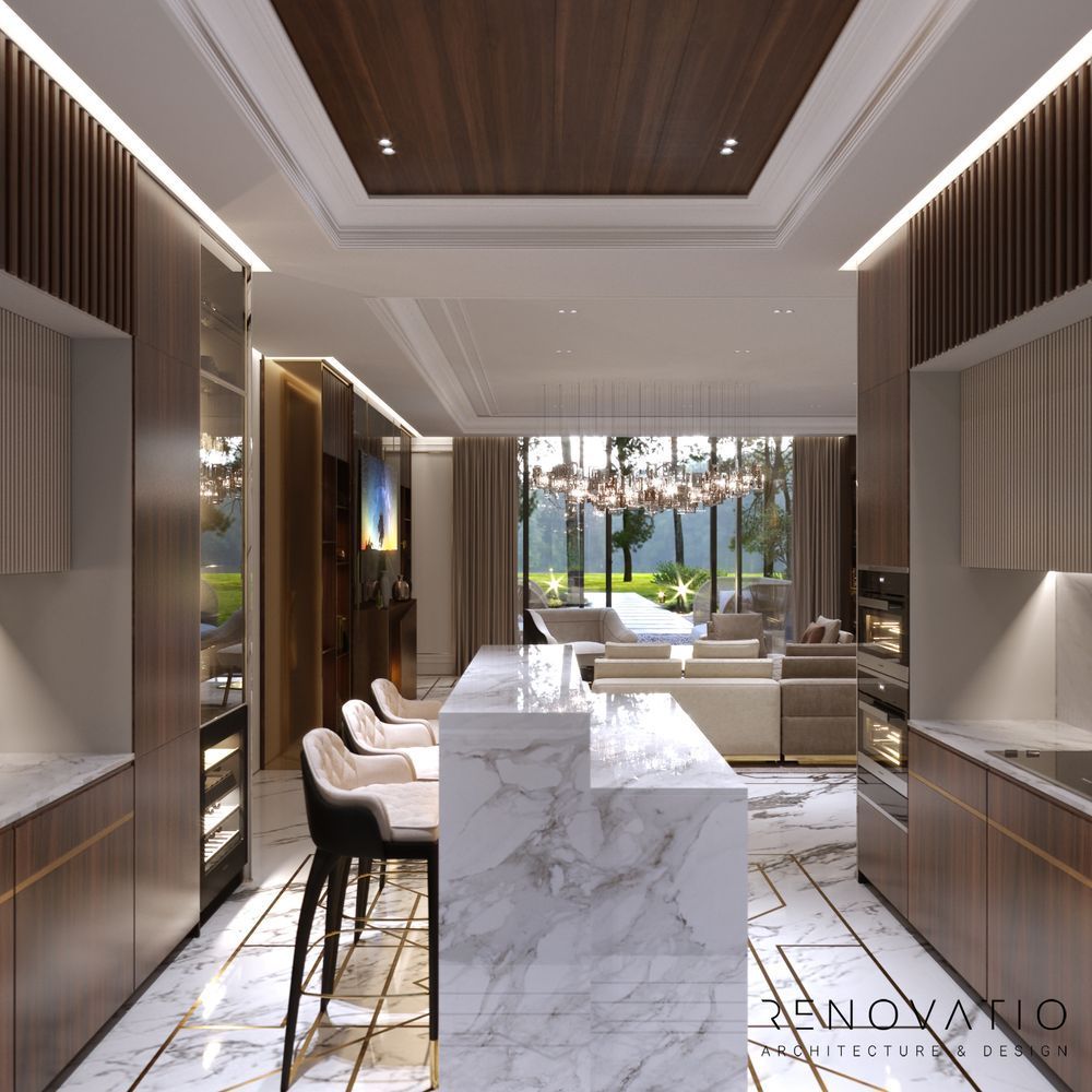 Lots of light and space is the basic concept of the project. Wide panoramic windows, lots of built-in and designer lighting give the interior richness and sophistication. The kitchen is made in a combination of white natural stone, marble floor and natural wood inserts.