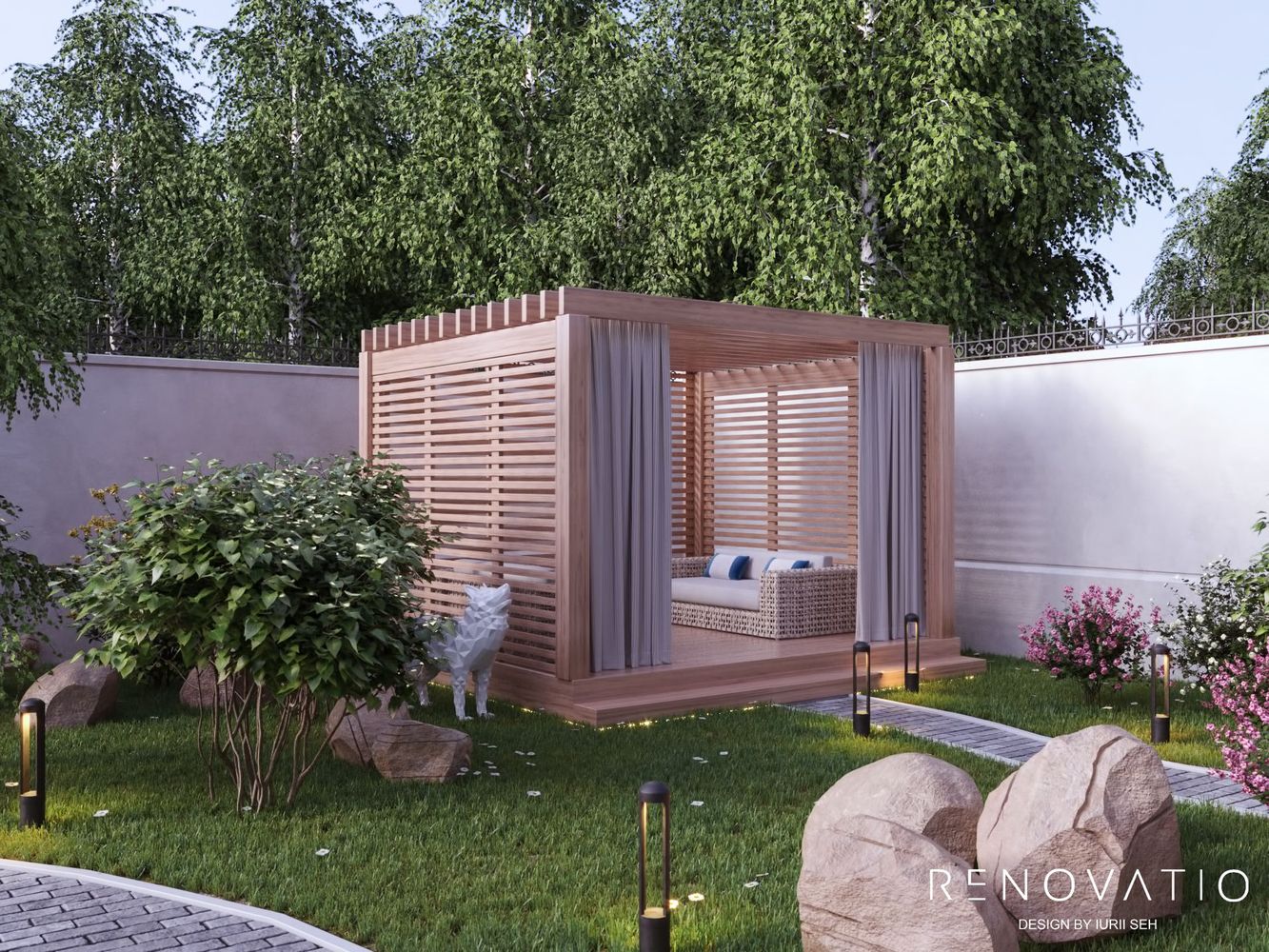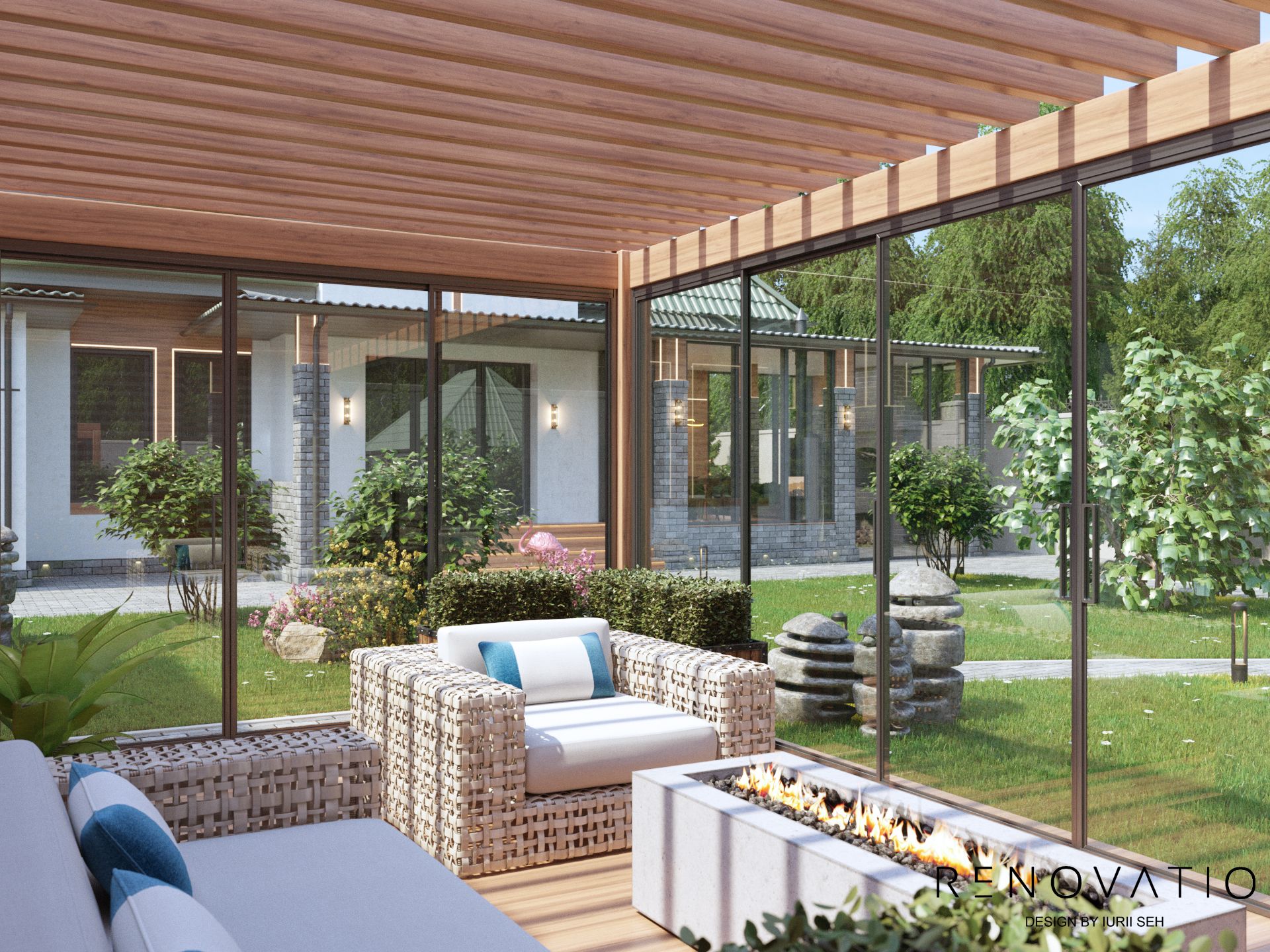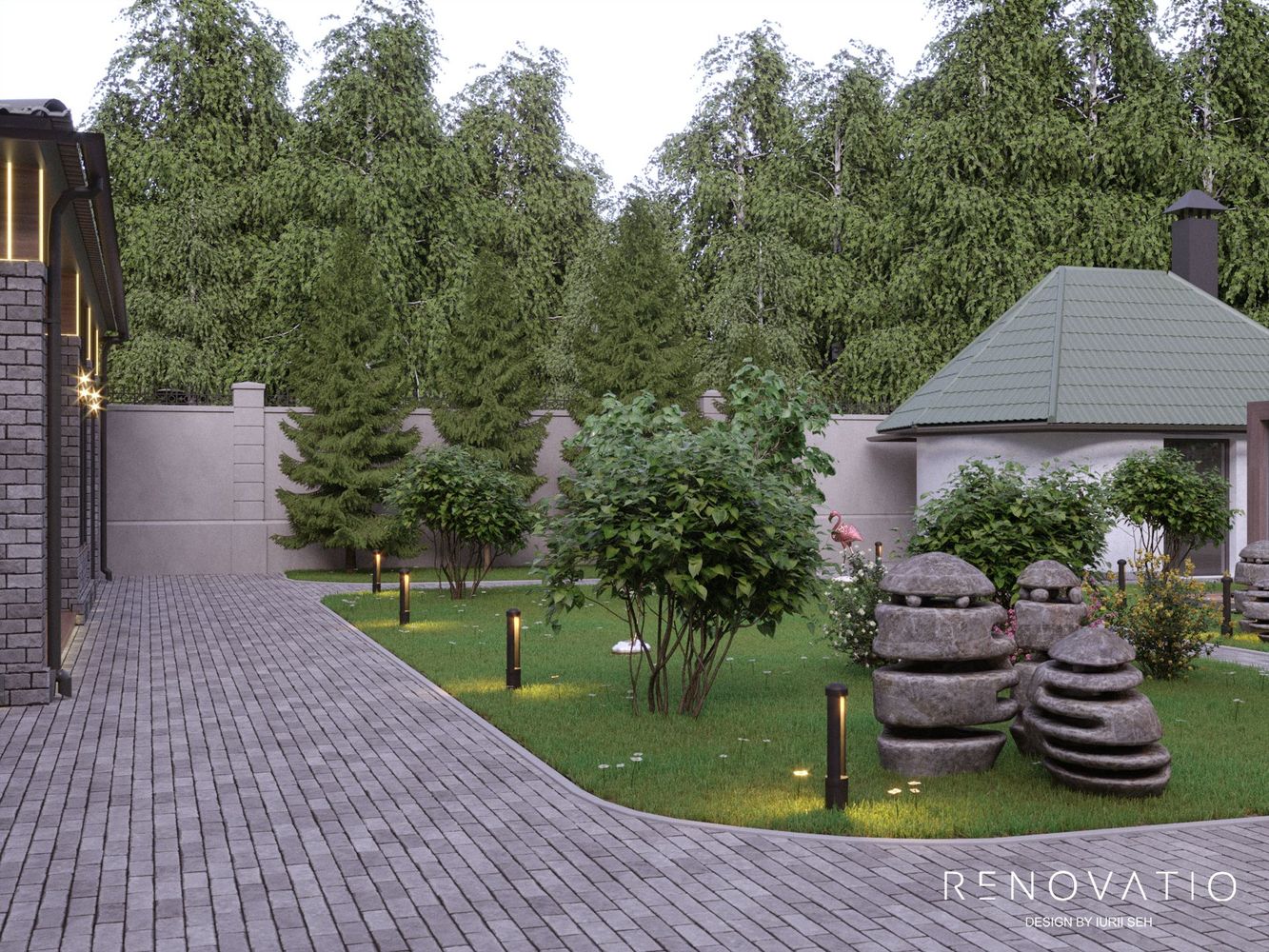 The exterior deserves special attention. A separate sitting area with upholstered furniture and a fireplace, as well as beautiful flower beds with diverse plants, huge stones and art sculptures - all these elements have created a harmonious garden area. Special lighting is built into the ground and creates a special romantic magic in the evening.