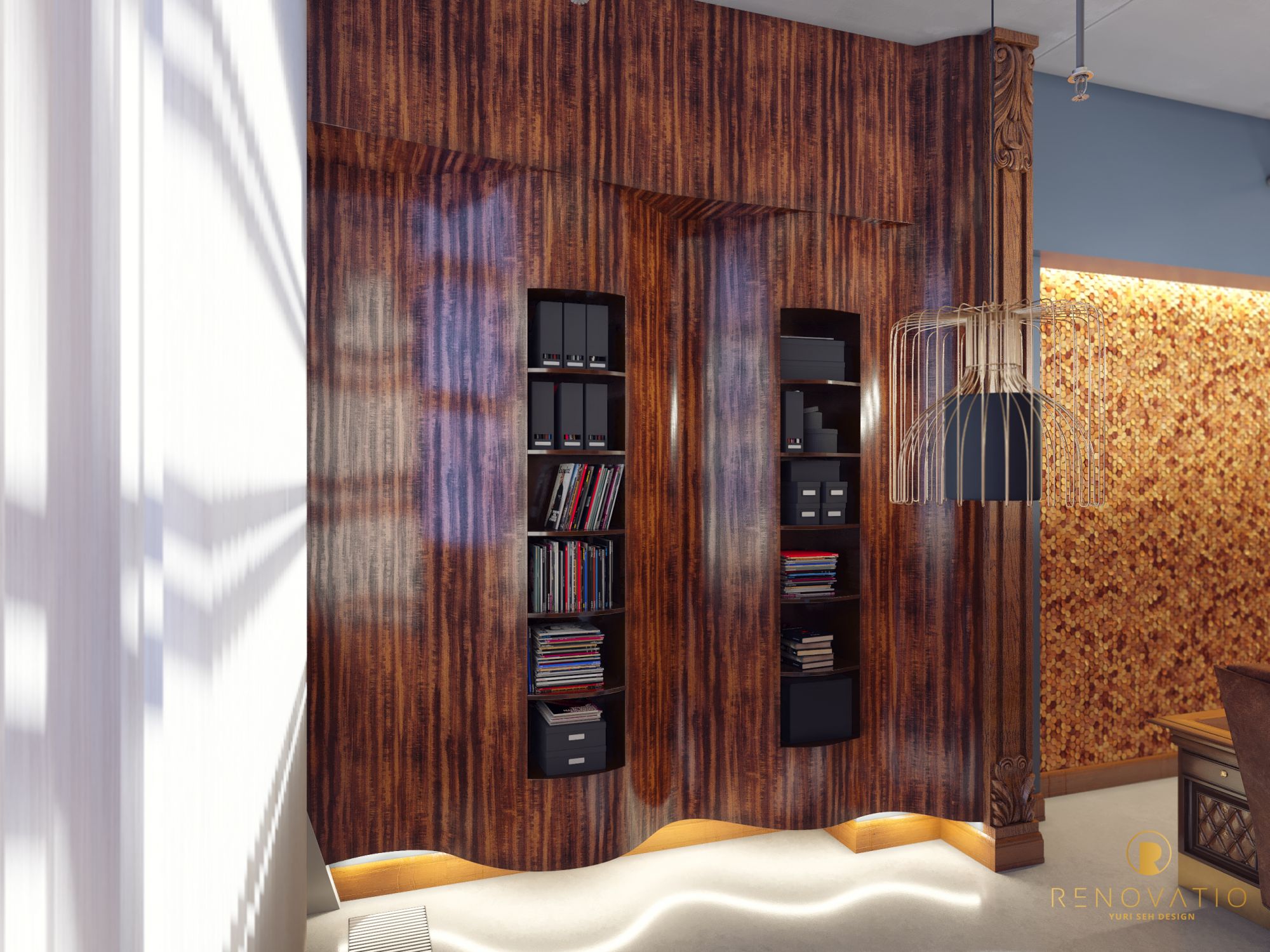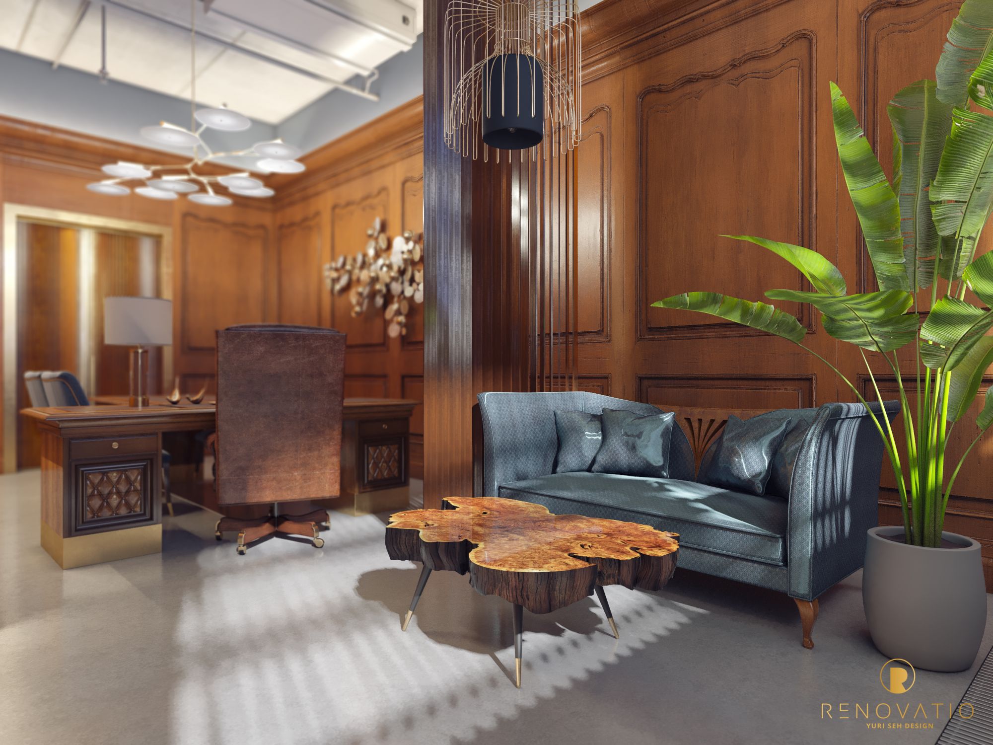 Wood surfaces and dark gray textiles added respectability and status to the design. And the original table in the form of a log tree has become a real highlight.