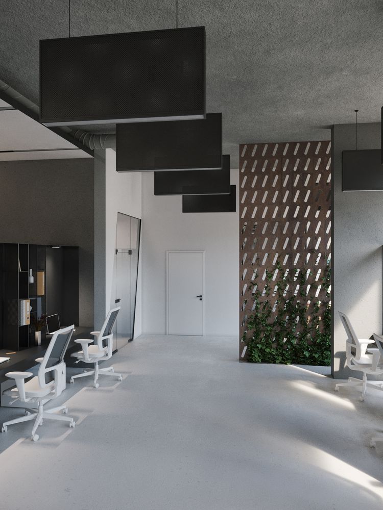 The restrained style is permeated with conceptual solutions that are dictated by the shape of the room itself. Based on various shades of gray. It does not distract, maximizes attention and improves the self-organization of employees.